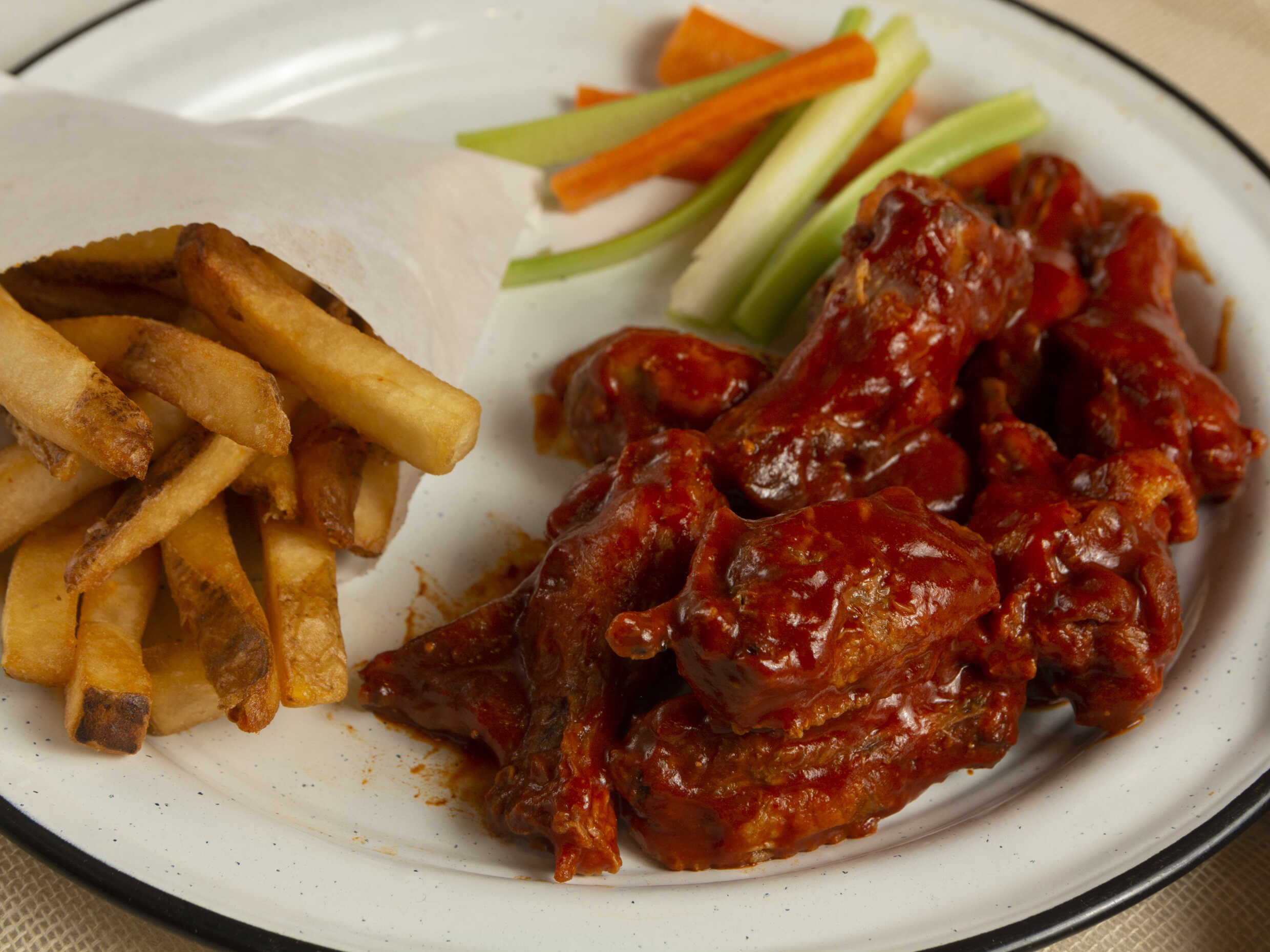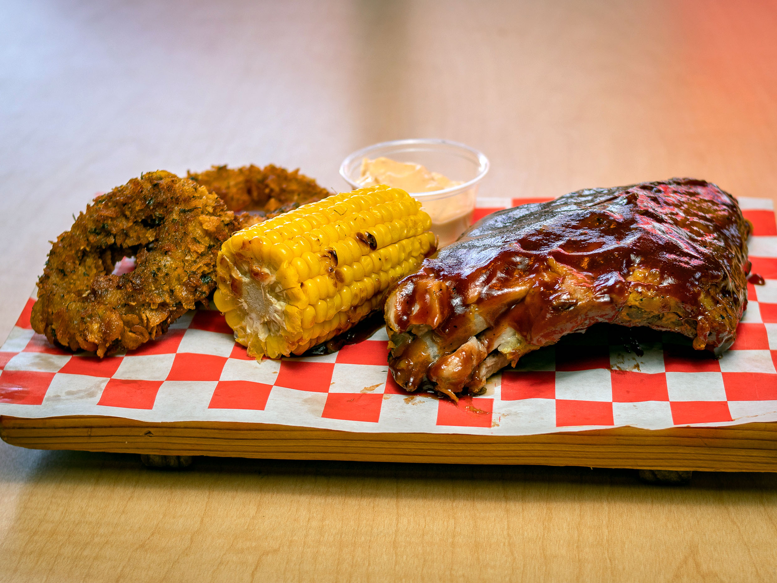 4 costillas suaves de Baby Pork asadas y bañadas en salsa BBQ. Acompañado de 2 guarniciones.