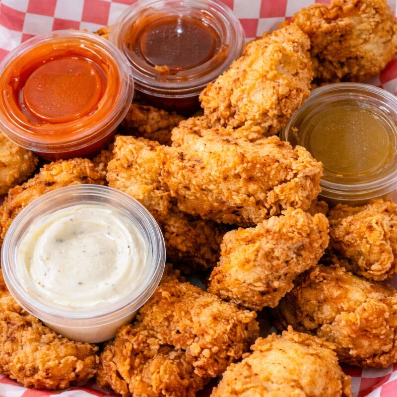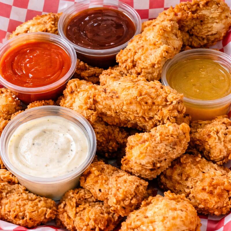 Trozos grandes de pechuga con empanizado super crujientes. Acompañados de 2 recipientes de Salsas a elegir y 1 Aderezo ranch ideales para Dippear