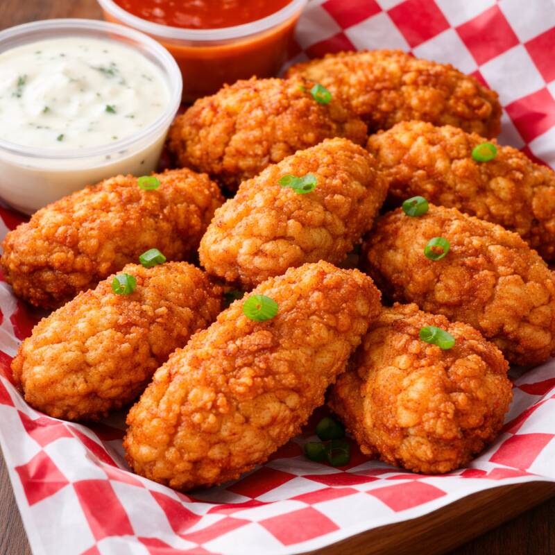 Deliciosos trozos de pechuga empanizada super crujientes con 3 recipientes de Salsas a elegir y 1 Aderezo ranch Ideales para chapear