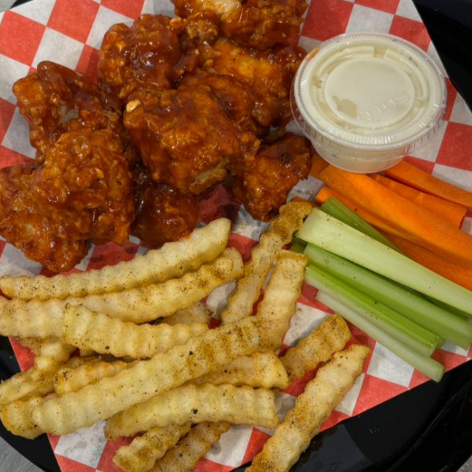 10 piezas de deliciosos boneless bañados en la salsa de tu elección, acompañados con papas sazonadas, zanahoria, apio y aderezo ranch
