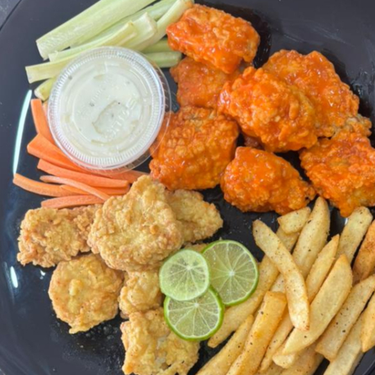 50 piezas de deliciosos boneless bañados en la salsa de tu elección, acompañados con papas sazonadas, zanahoria, apio y aderezo ranch