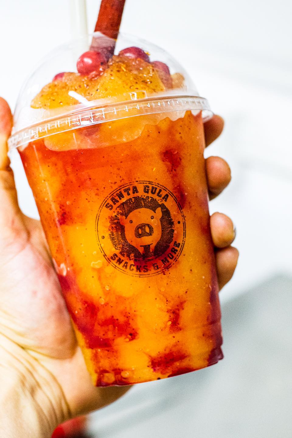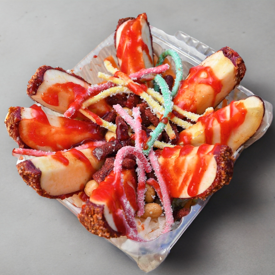 Manzana cubierta de tamarindo y chilito en polvo con pepino, jícama y zanahoria bañada en chamoy con cacahuate japones y gomitas.