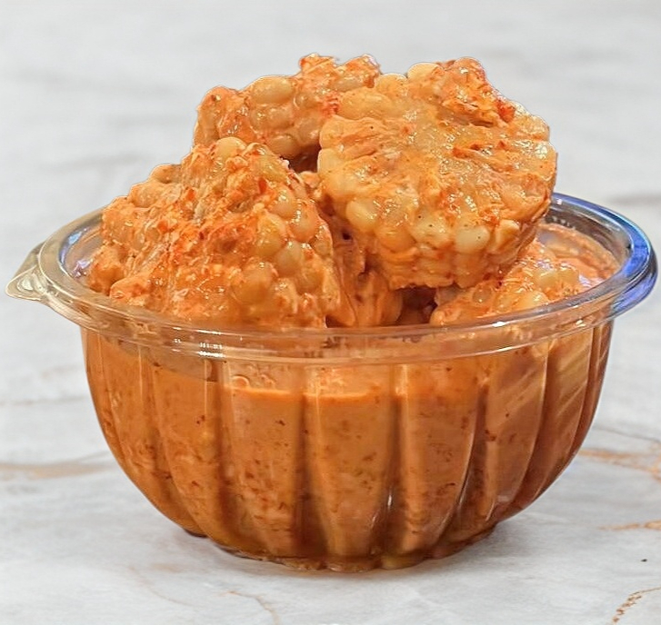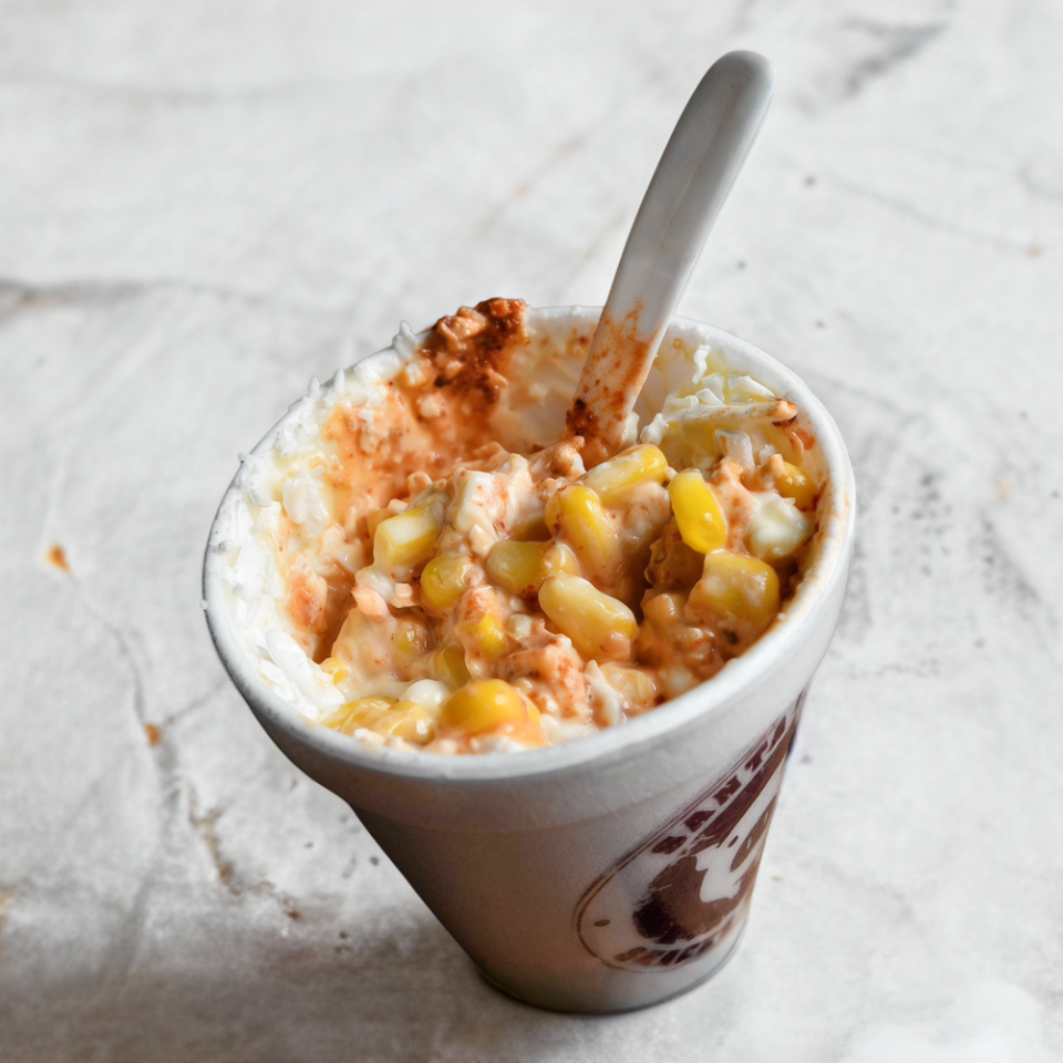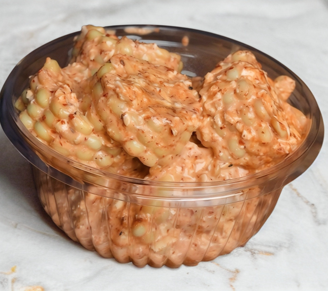 Calientitos trocitos de elote con mayonesa y queso y al toque especial de Santa Gula.
