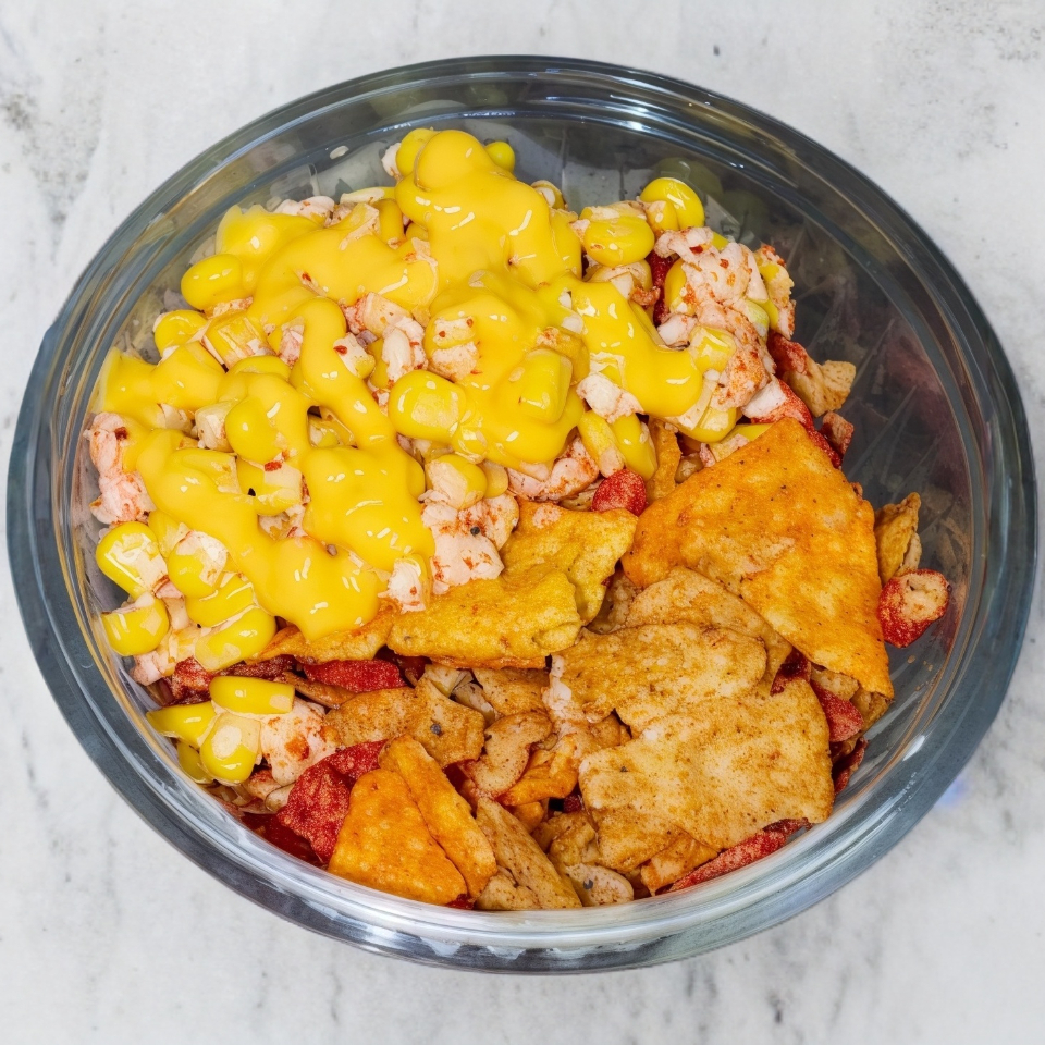 Deliciosa mezcla de Doritos, Tostitos, Tostitos Flaming Hot, Cheetos Flaming Hot, Takis Fuego, en trocitos bañados con elote desgranado preparado y queso amarillo arriba.