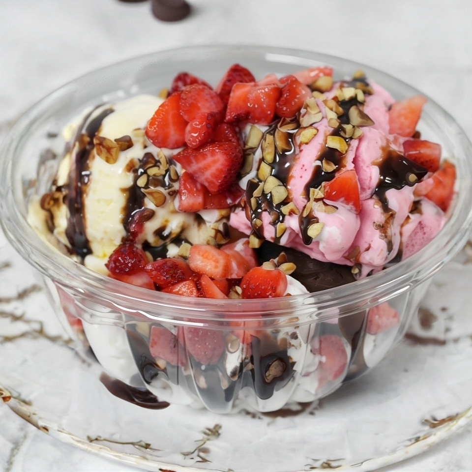 Nieve de Yogurt Mediana ( fresa, banano, piña almíbar jarabe de mora, fresa chocolate nueces ) con 2 Toppings almendras con chocolate perlas explosivas de fresa gomas de pandita luneta y arándanos