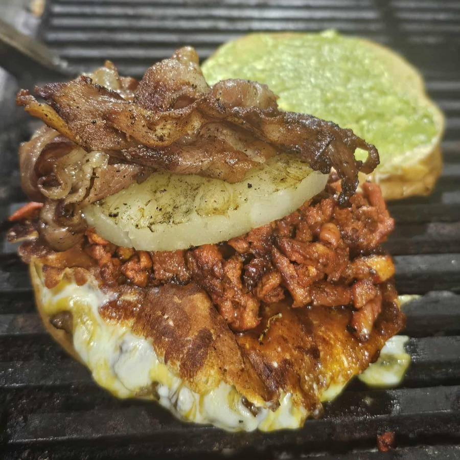 Carne de res, queso gratinado, pastor, piña, tocino, guacamole, incluye papas fritas y refresco