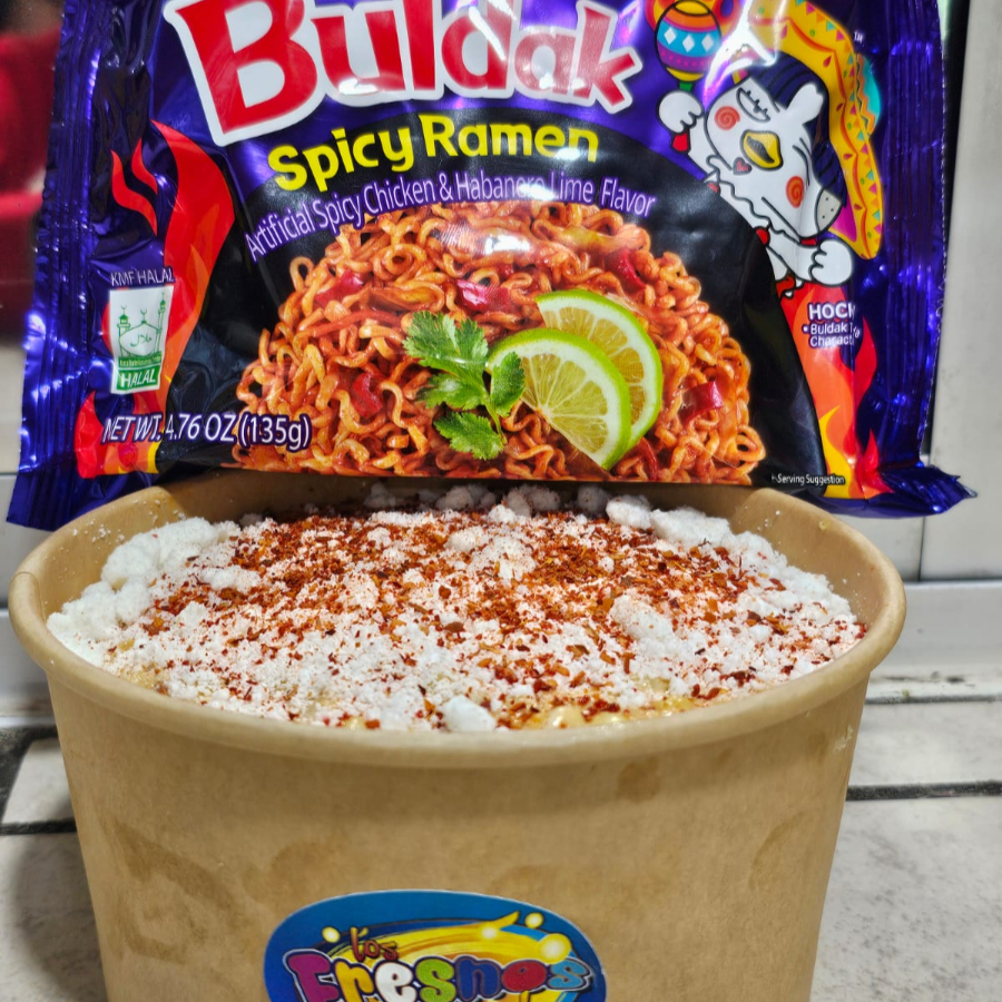 Elote preparado con mantequilla mayonesa queso fresco y salsa preparada.