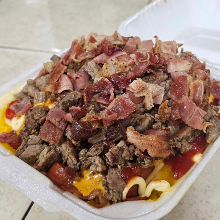 papas frita con salchicha, queso cheedar, queso mozarella, catusp, salsa chipotle