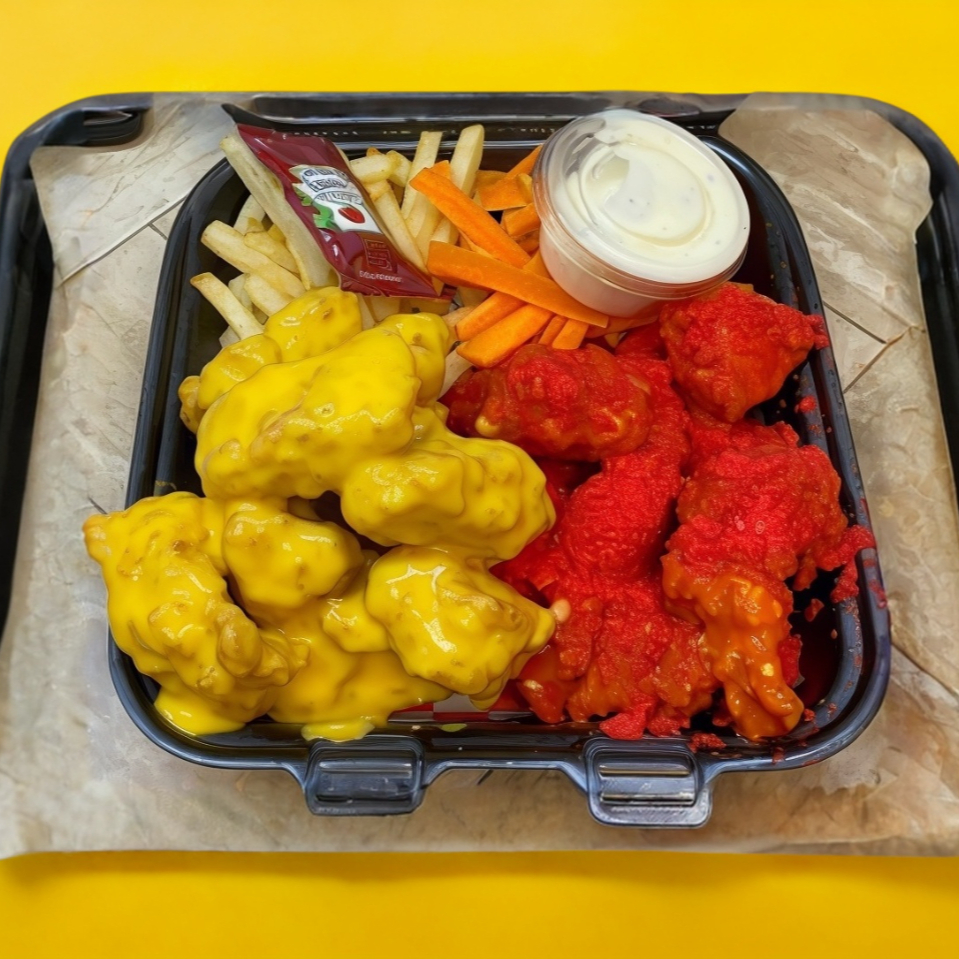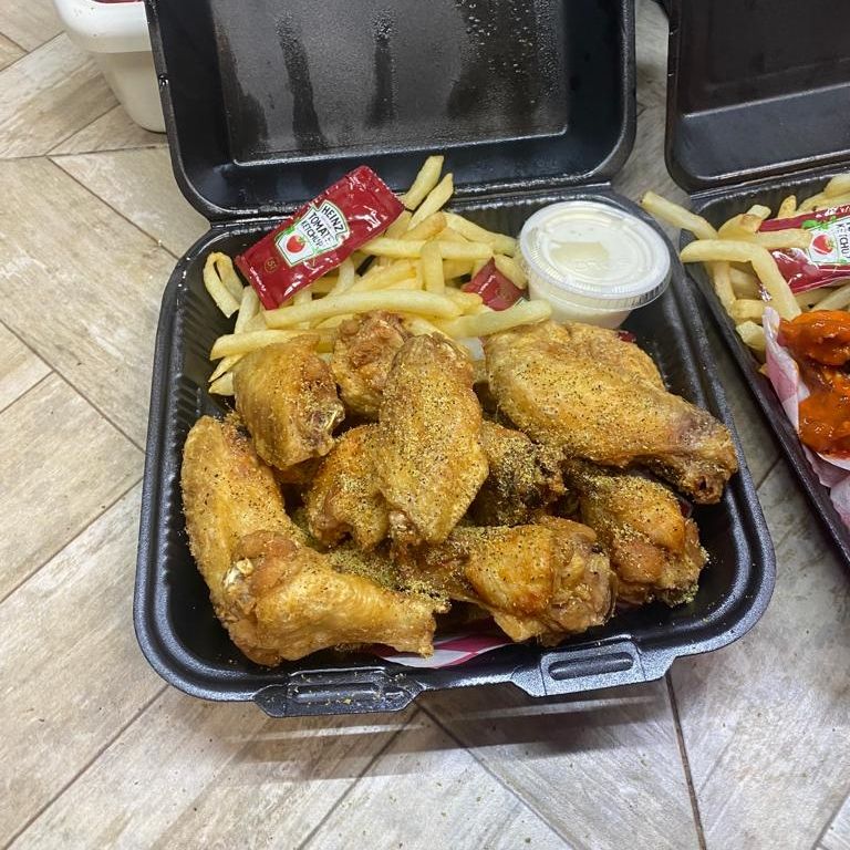 8 alitas personales acompañado porcion personal papas francesa y salsa a disposicion de la tienda