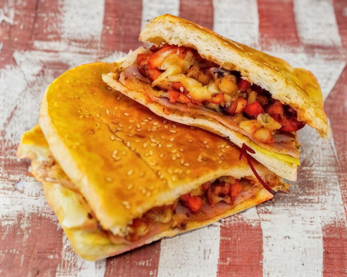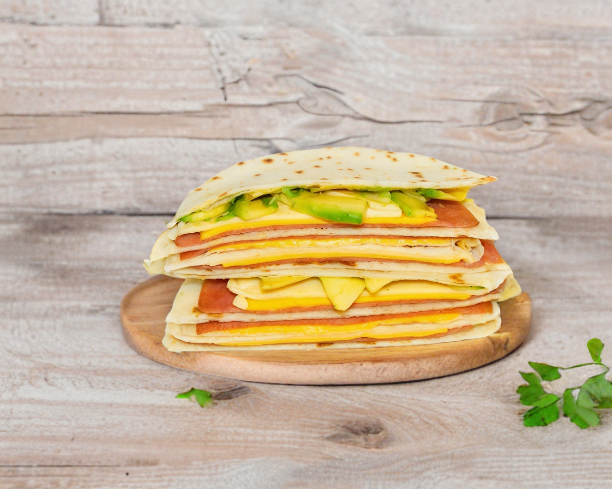 4 tortillas de harina, jamon, queso chihuahua y queso amarillo
