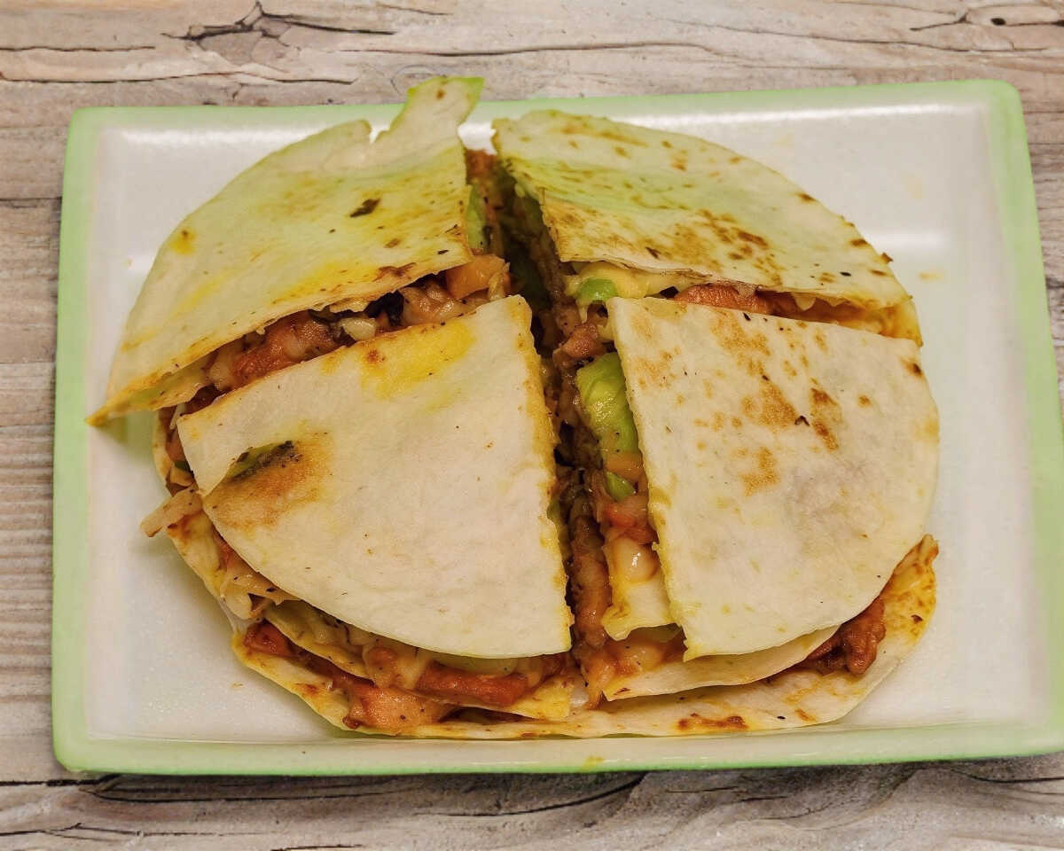 4 tortillas de harina, carne al pastor y queso chihuahua