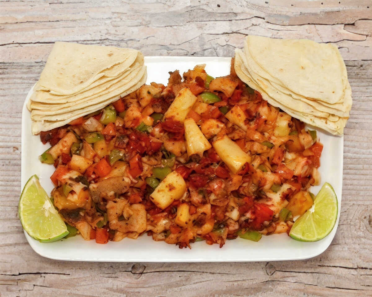 Platillo con milanesa, jamón, salchicha, pimiento morrón, chorizo, cebolla, queso chihuahua, piña y 4 tortillas