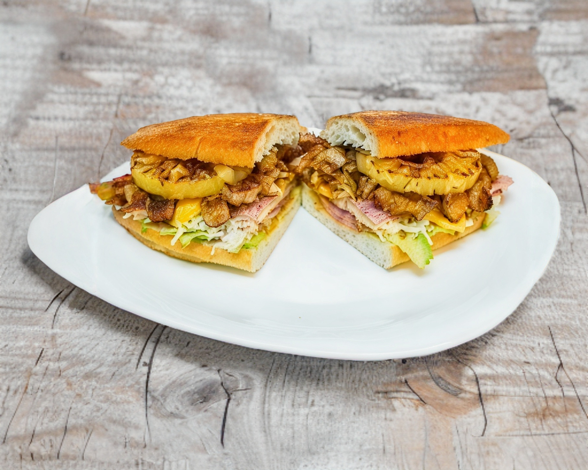 Pierna, milanesa, jamón, queso amarillo, queso blanco y piña