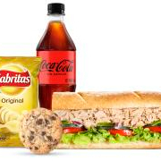 Atún mezclado con mayonesa, con el queso y vegetales de tu elección, más papas, galleta y bebida.