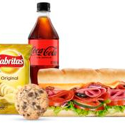 Rebanadas de salami, pepperoni y jamón de cerdo, con el queso y vegetales de tu elección, más papas o galleta y bebida.