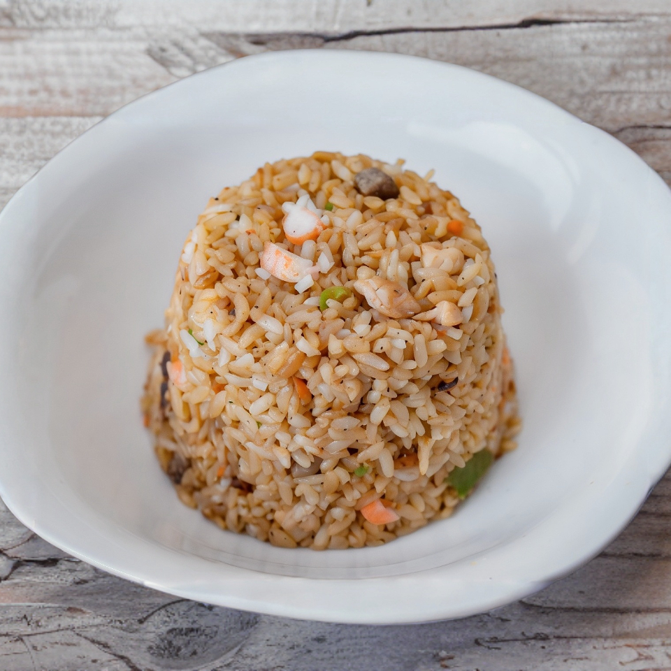 Arroz frito con pollo, carne, camarón, germinado y champiñón.