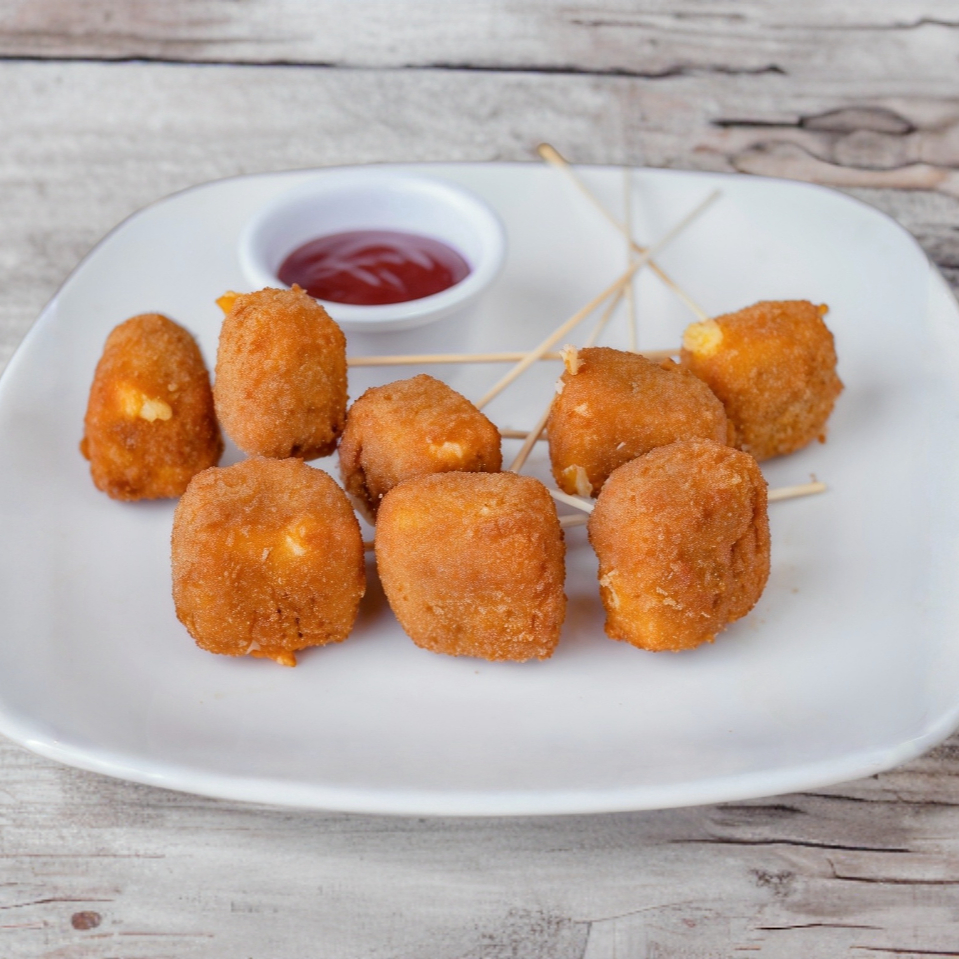 Brochetas de queso gouda empanizado.