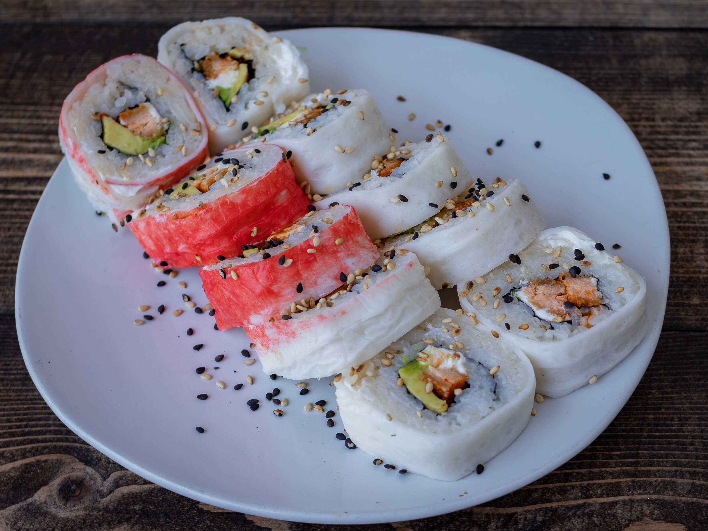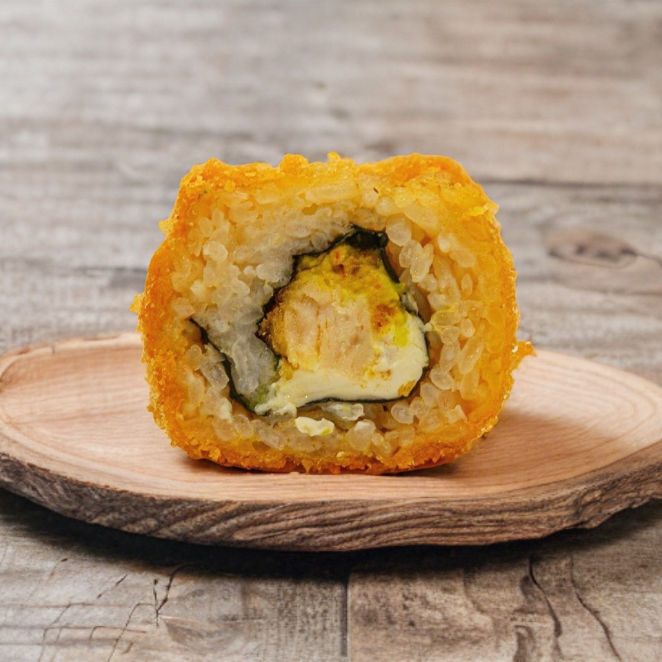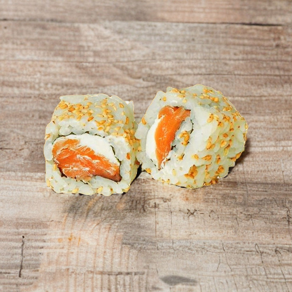 Arroz blanco, queso, aguacate, salmón, envuelto en surimi.