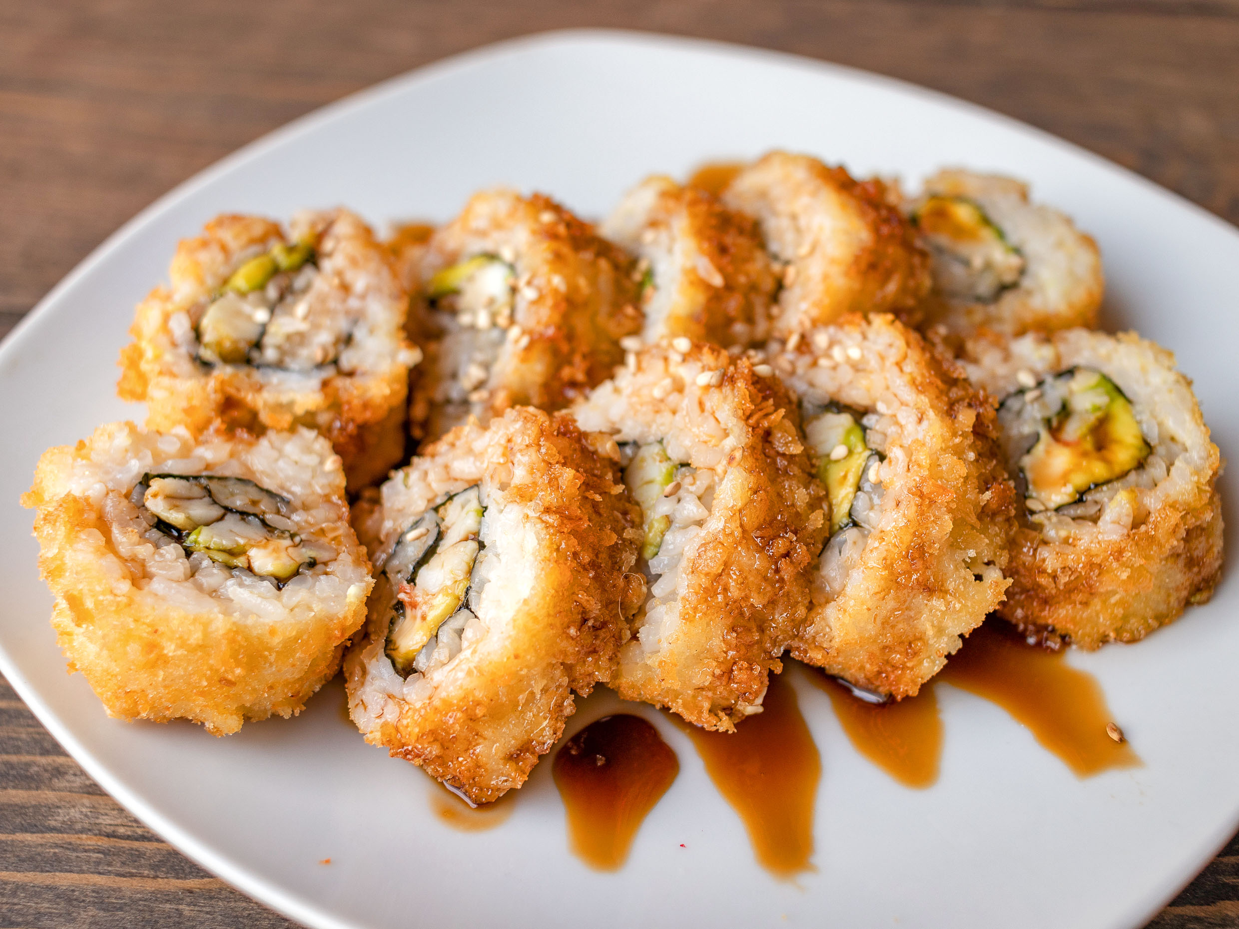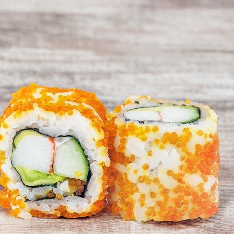 Camarón capeado, aguacate y masago por fuera.