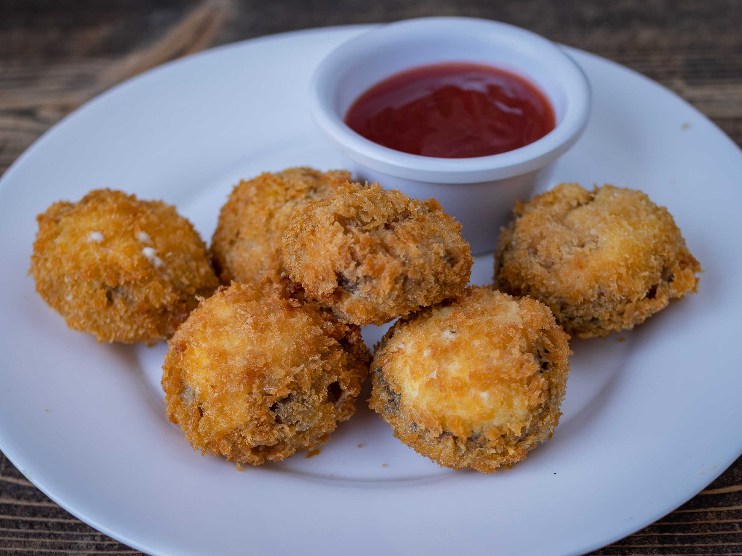 6 Champiñones empanizados rellenos con Tampico, queso, bañados con aderezo de chipotle.
