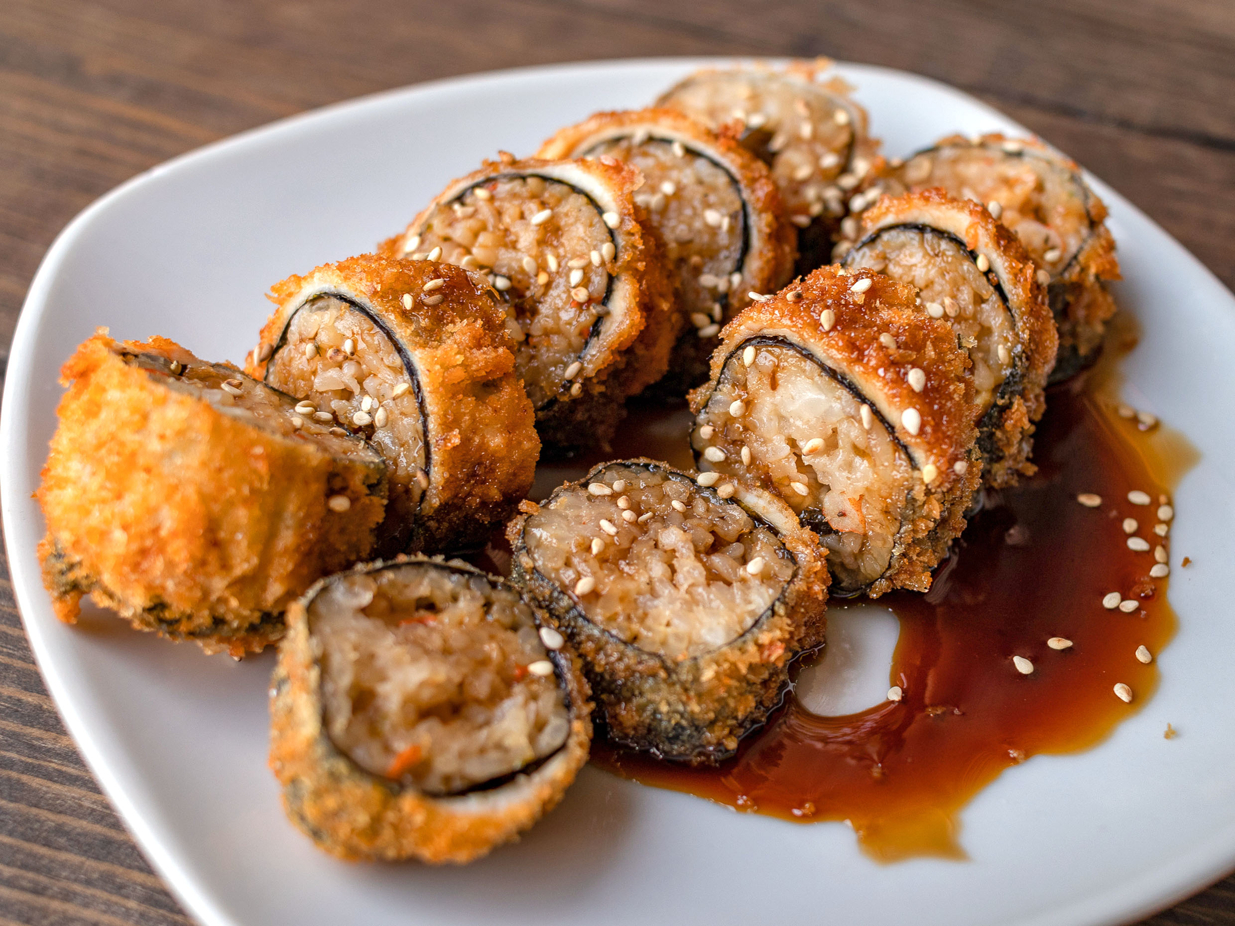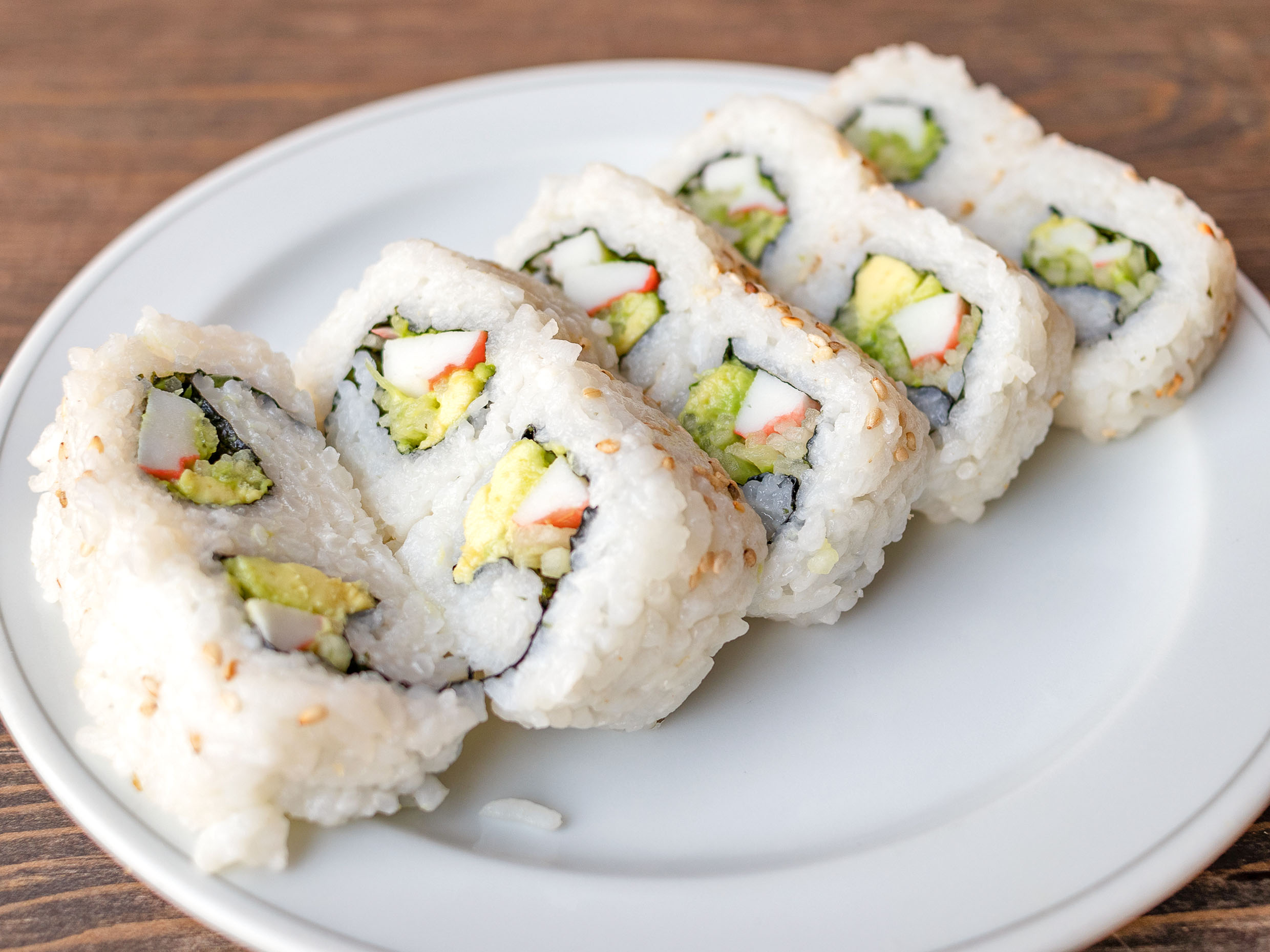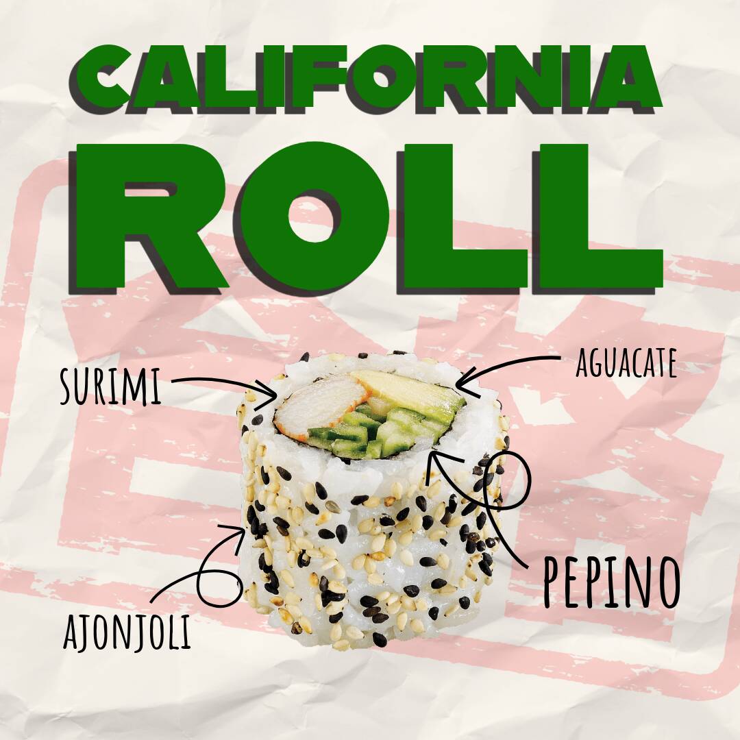 Aguacate, pepino, surimi, con arroz gohan por afuera con ajonjoli, alga por dentro.