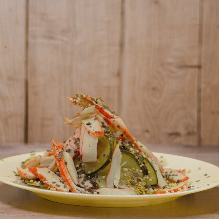 Pepino rallado con vinagre, furikake, camarón, cangrejo y pulpo.