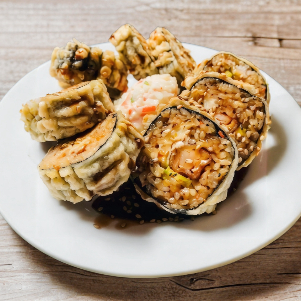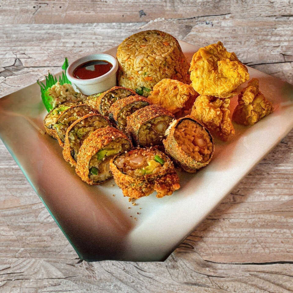 Rollo narita, arroz frito, con 3 piezas de boneless naturales