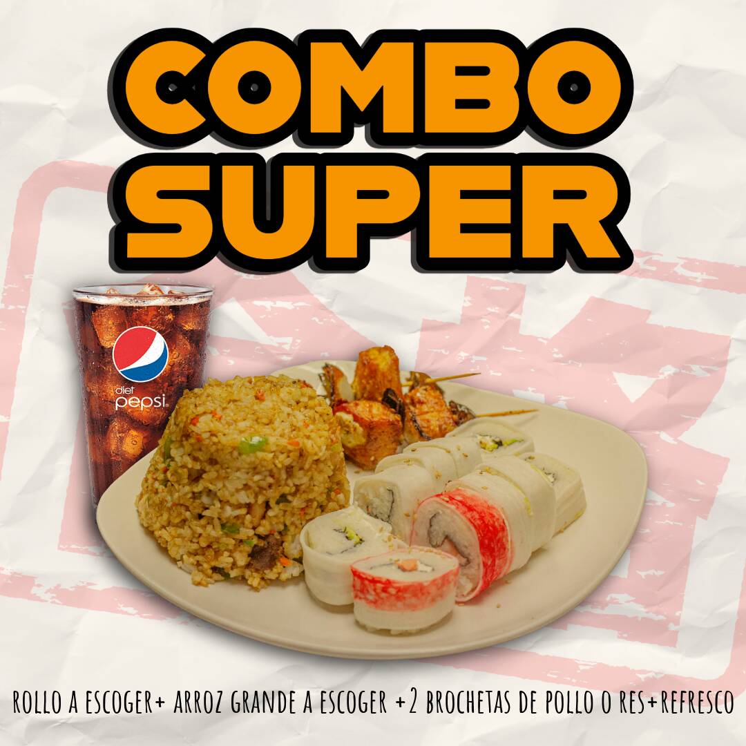 1 Rollo a escoger, arroz a escoger, 2 brochetas de pollo y refresco.