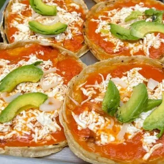 El platillo contiene 4 piezas, preparadas con salsa de tomate, Queso fresco, rajas de cebolla y aguacate, salsa picante aparte