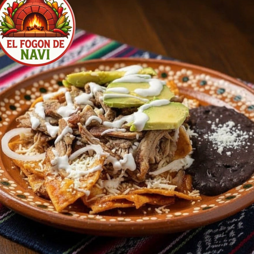 el platillo contiene chilaquiles en salsa roja de tomate , cebolla en rajas , frijoles negros , queso fresco , bistec y queso fresco