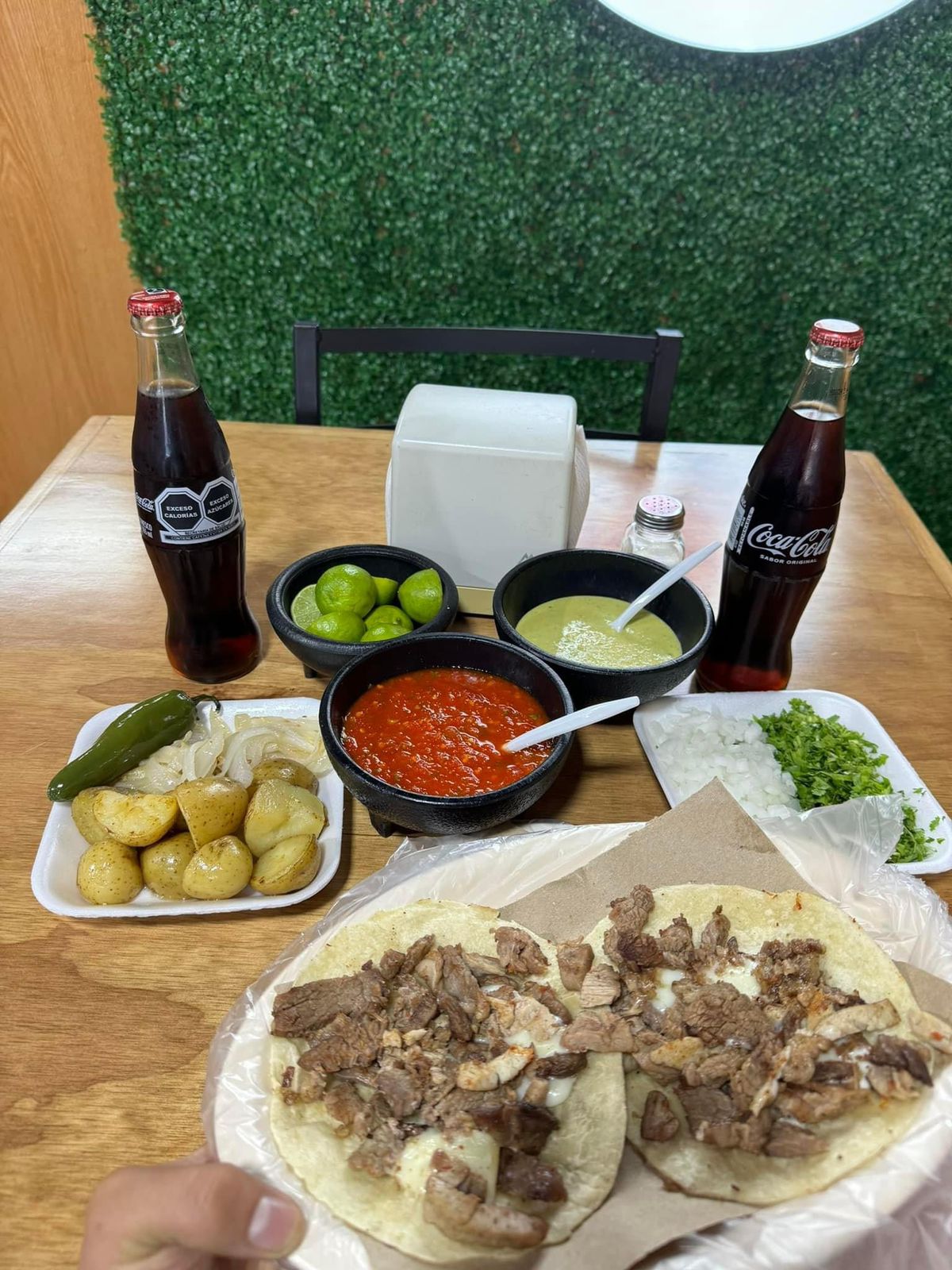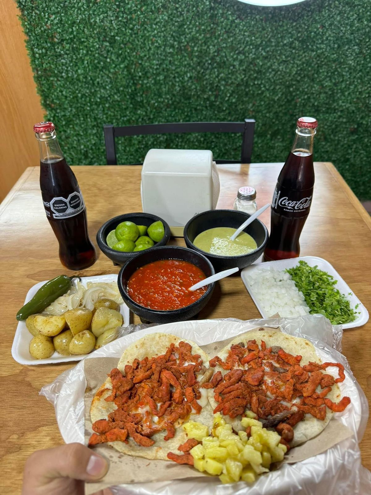15 TACOS PREPARADOS O NATURALES, 2 CHAROLAS DE PAPAS, CEBOLLA ASADA Y CHILES TOREADOS, 3 REFRESCOS A ELEGIR