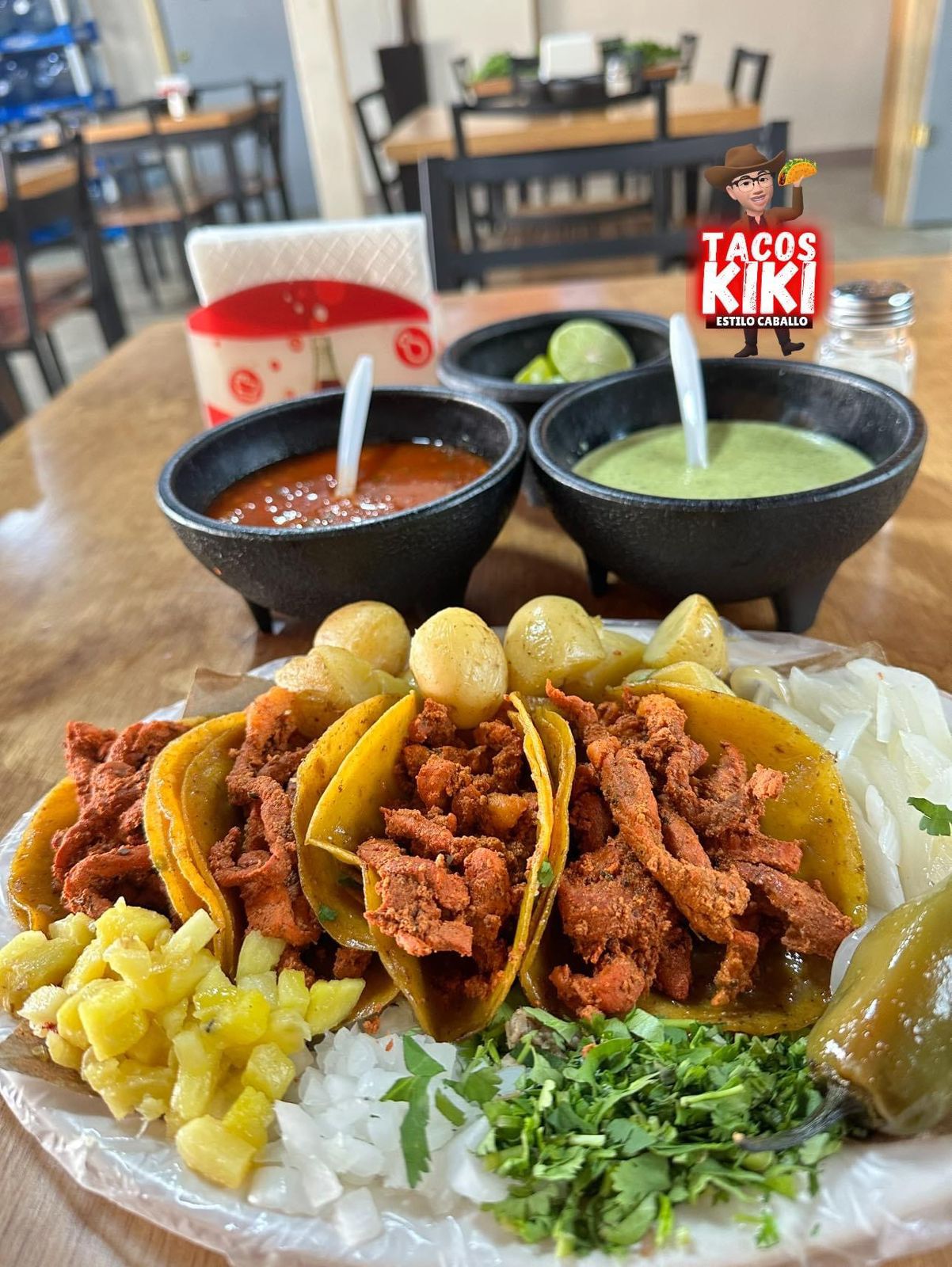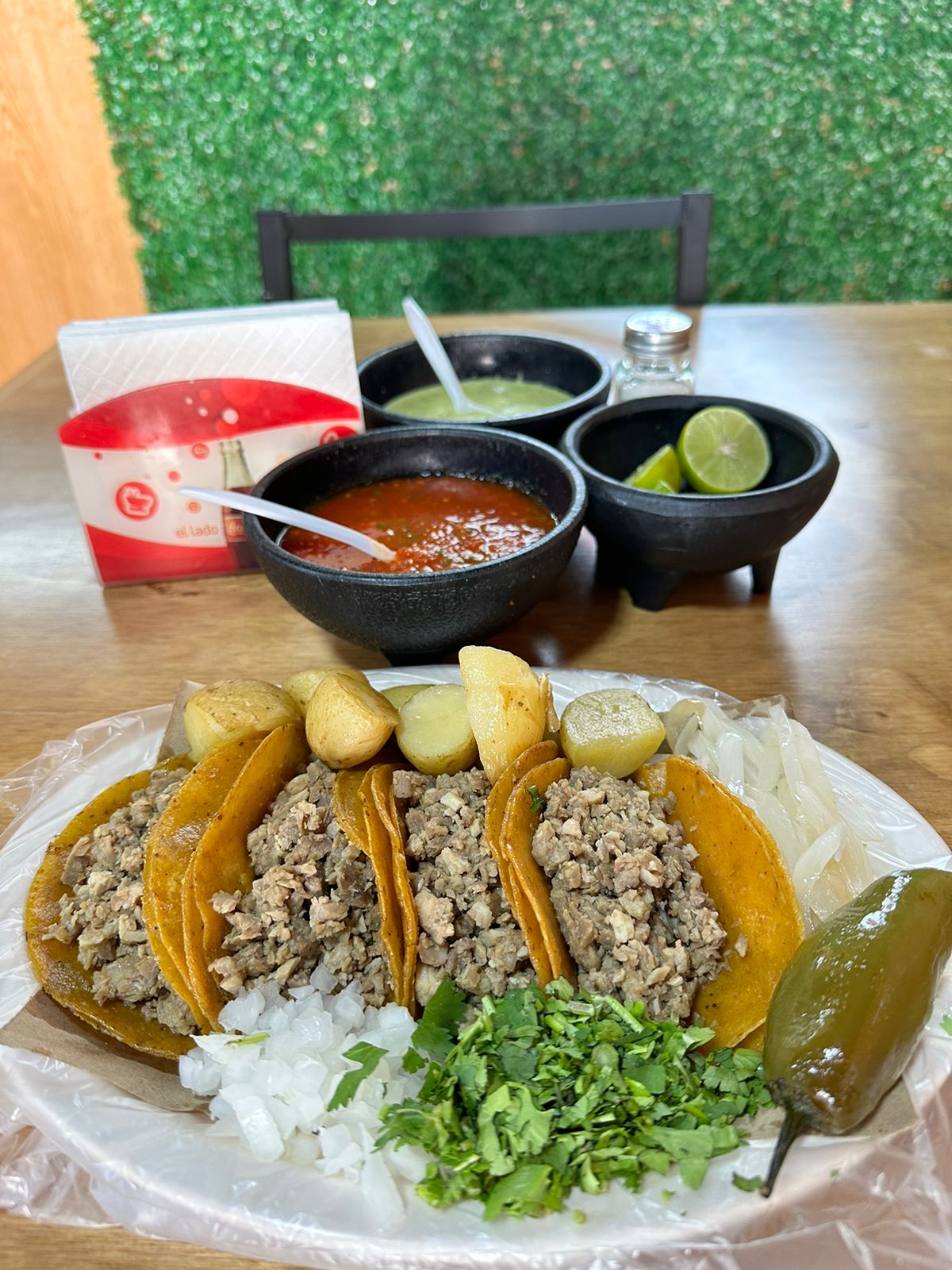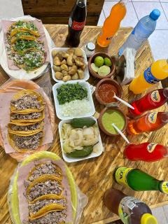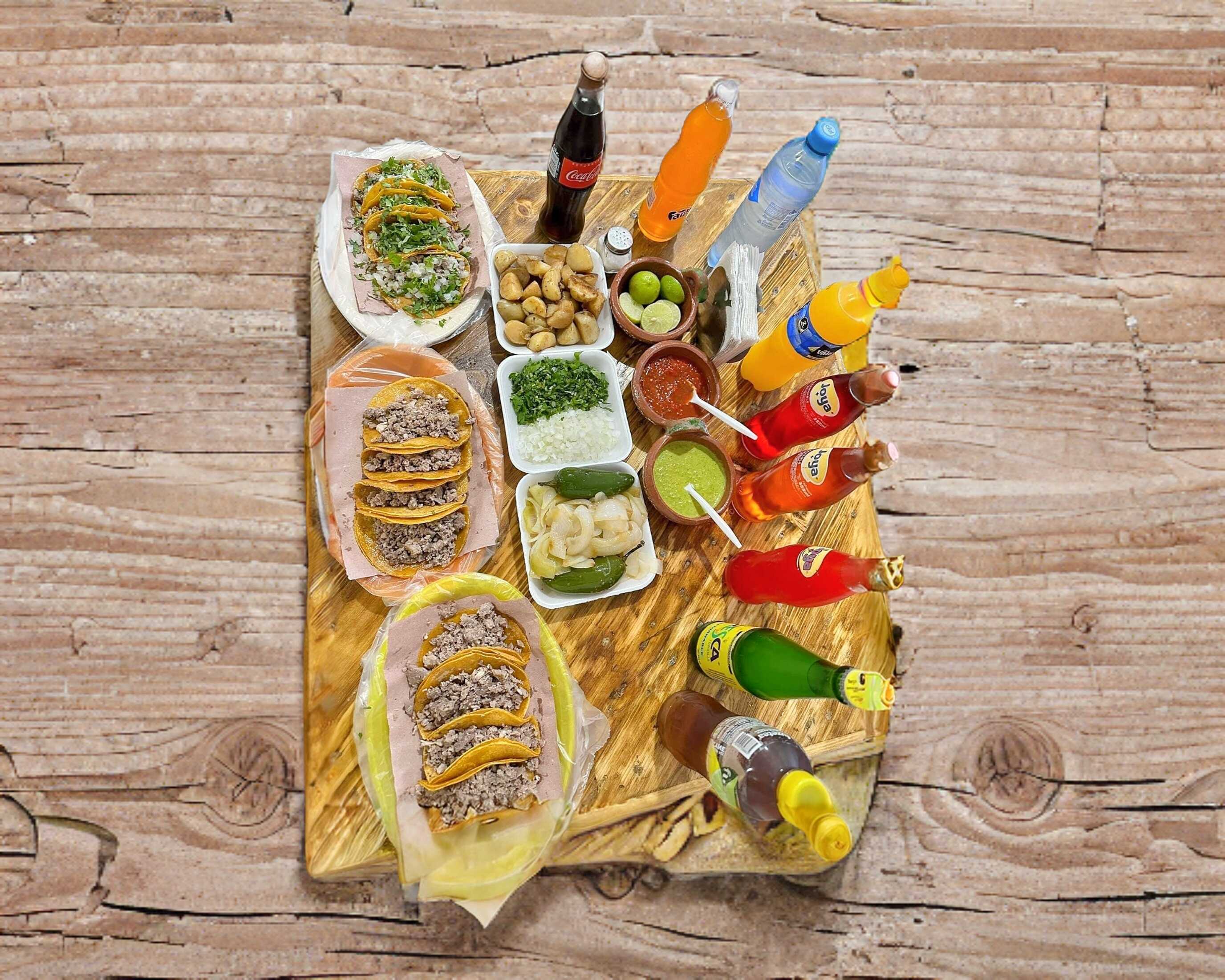 40 TACOS PREPARADOS O NATURALES, 4 CHAROLAS DE PAPAS, CEBOLLA ASADA Y CHILES TOREADOS, 8 REFRESCOS A ELEGIR