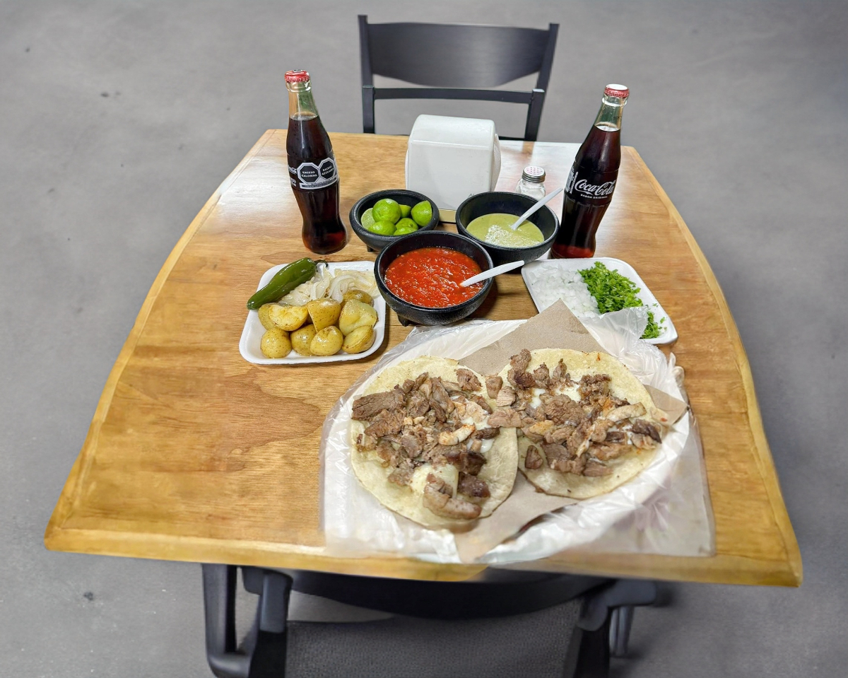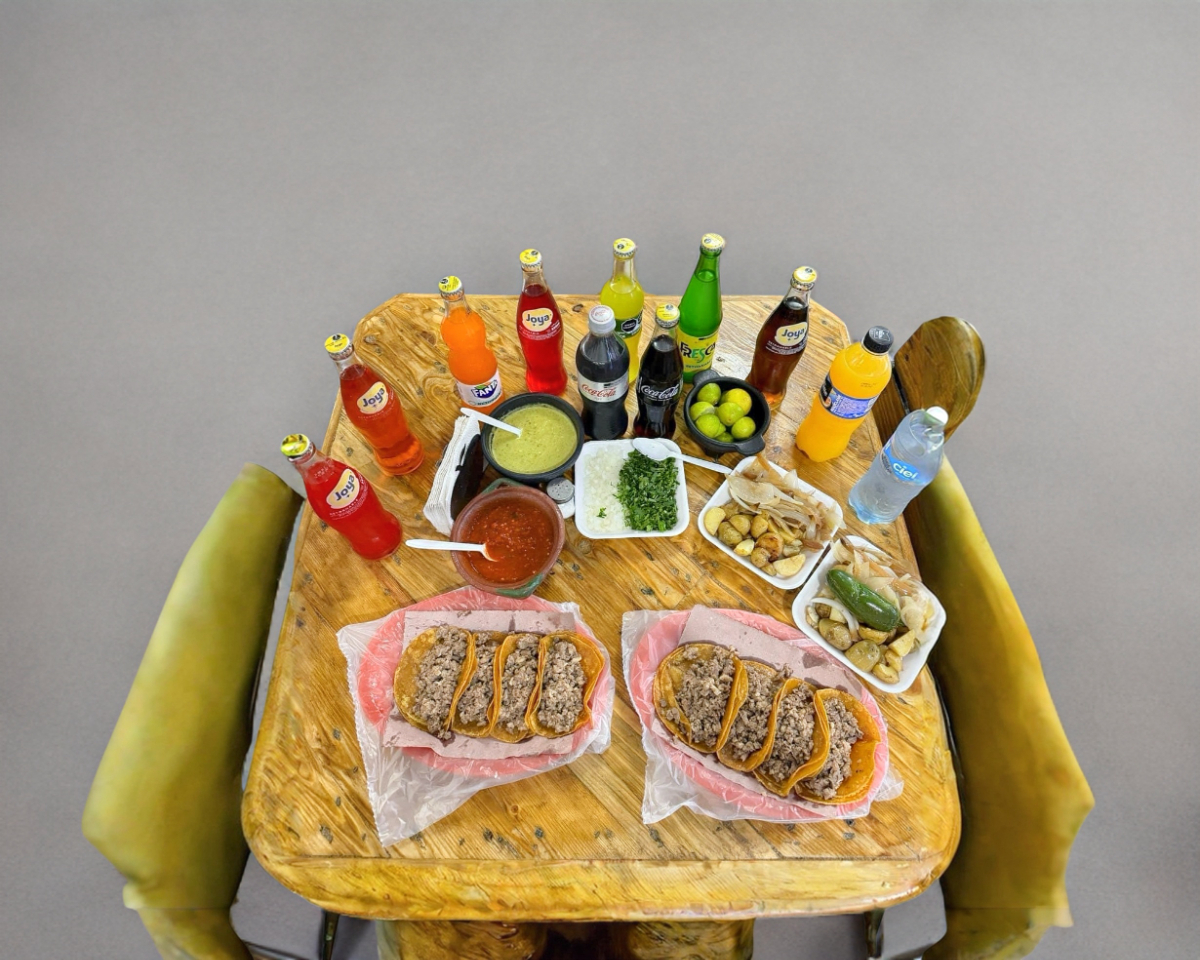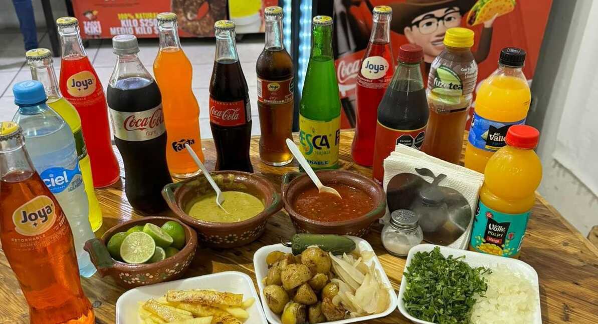40 TACOS PREPARADOS O NATURALES, 4 CHAROLAS DE PAPAS, CEBOLLA ASADA Y CHILES TOREADOS, 8 REFRESCOS A ELEGIR