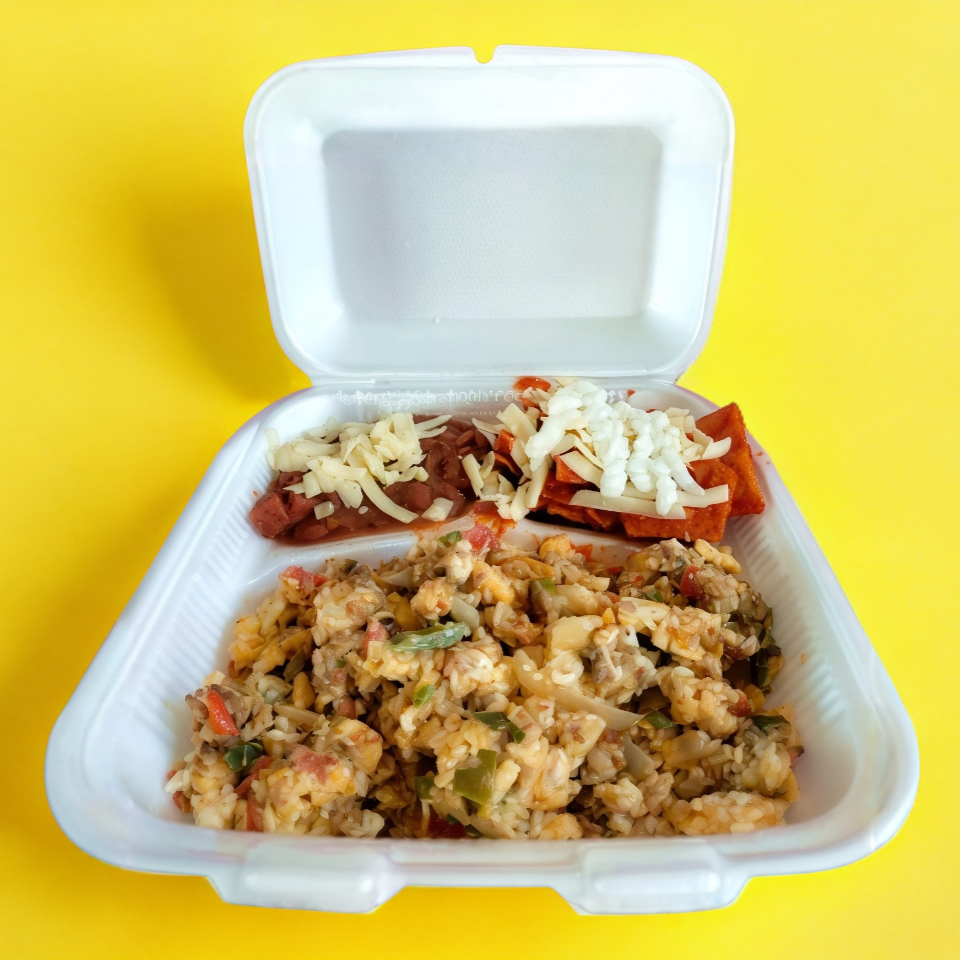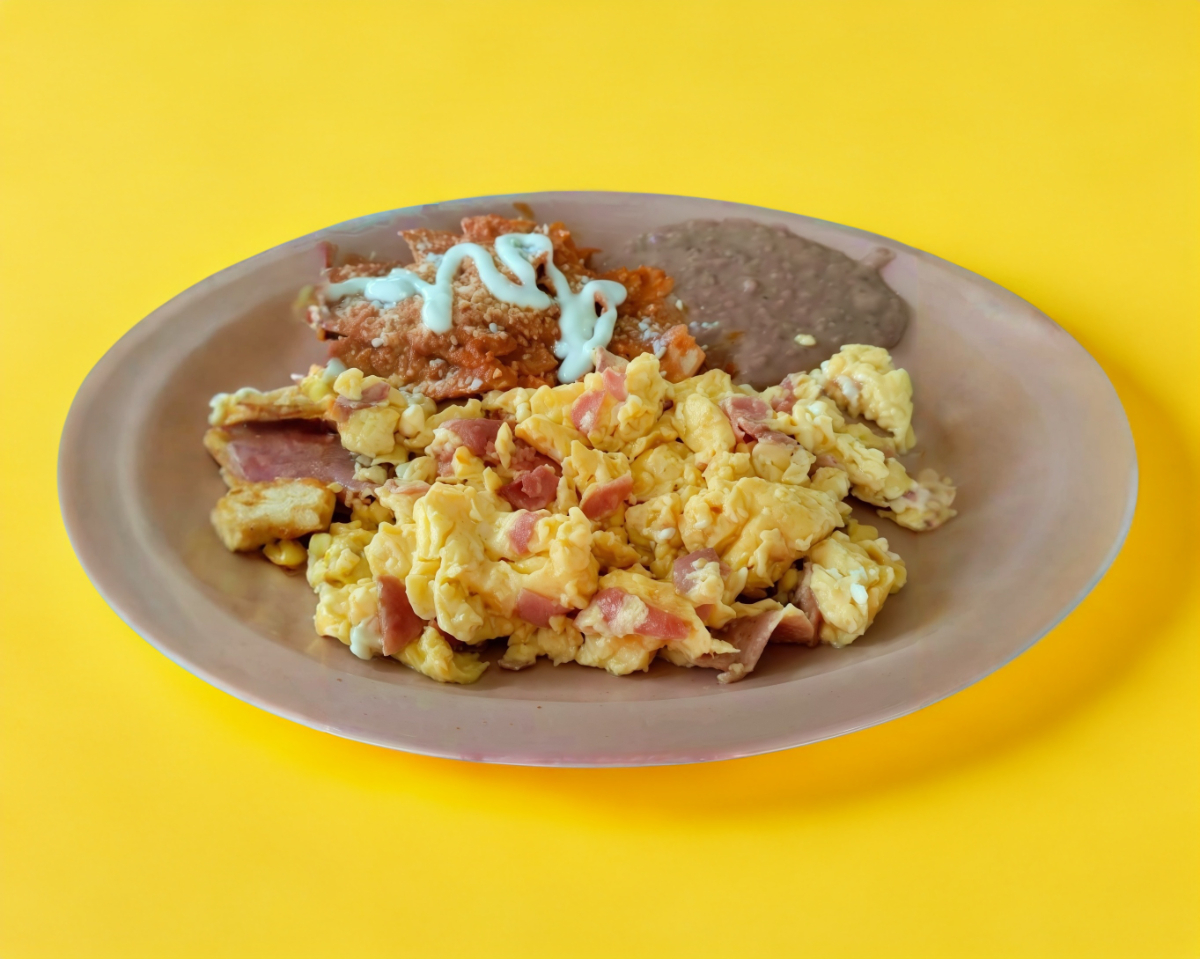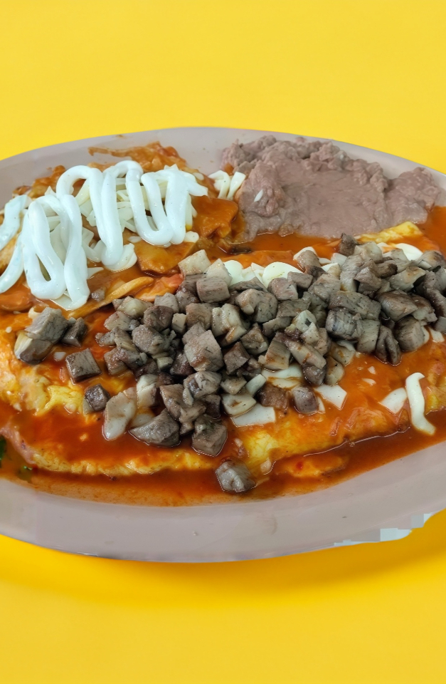 Acompañado de Frijoles refritos y una porción de chilaquiles Incluye tortillas de maíz.