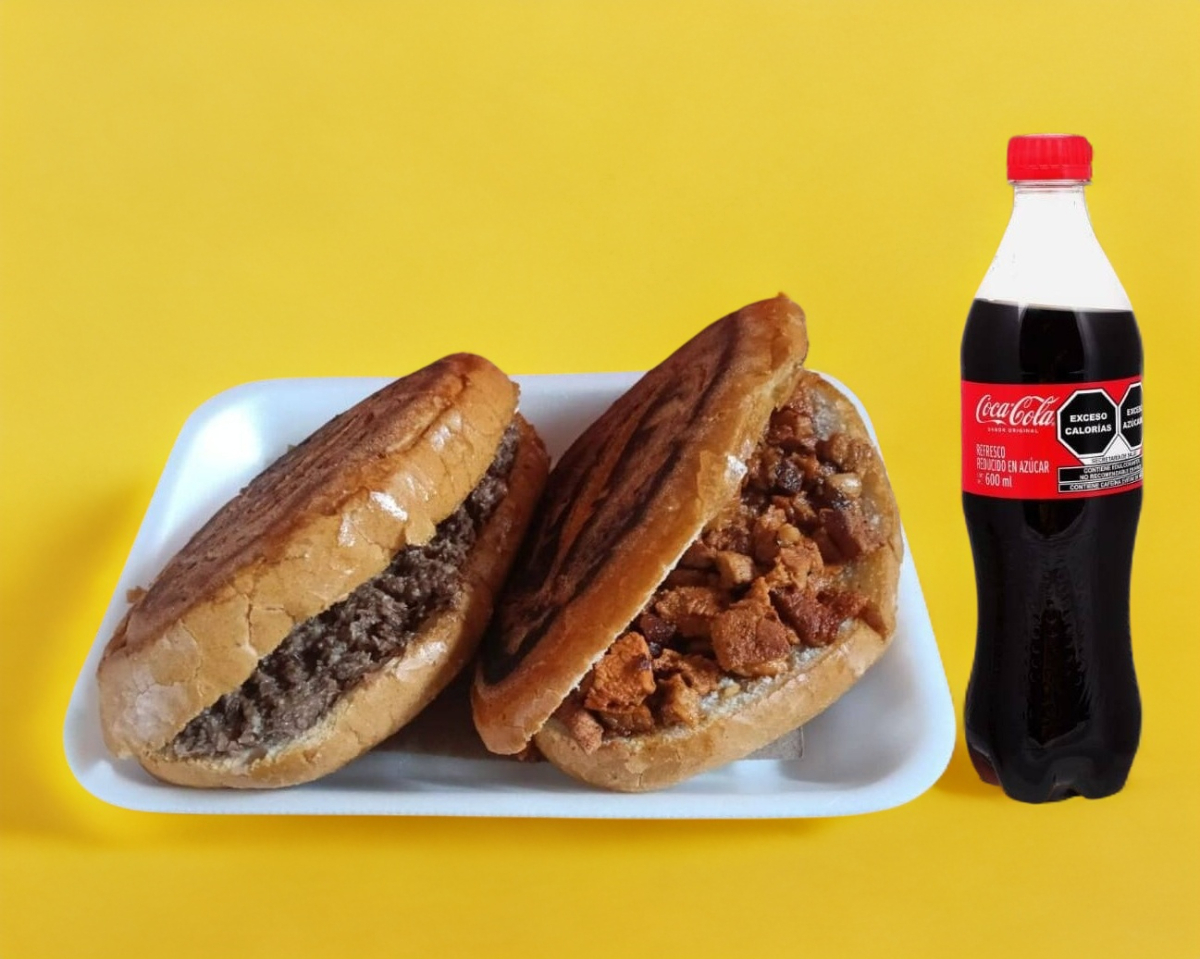 2 tortas a elegir y refresco(coca cola) 600 ML , acompañadas de verdura y salsa aparte para que el cliente los prepare al gusto