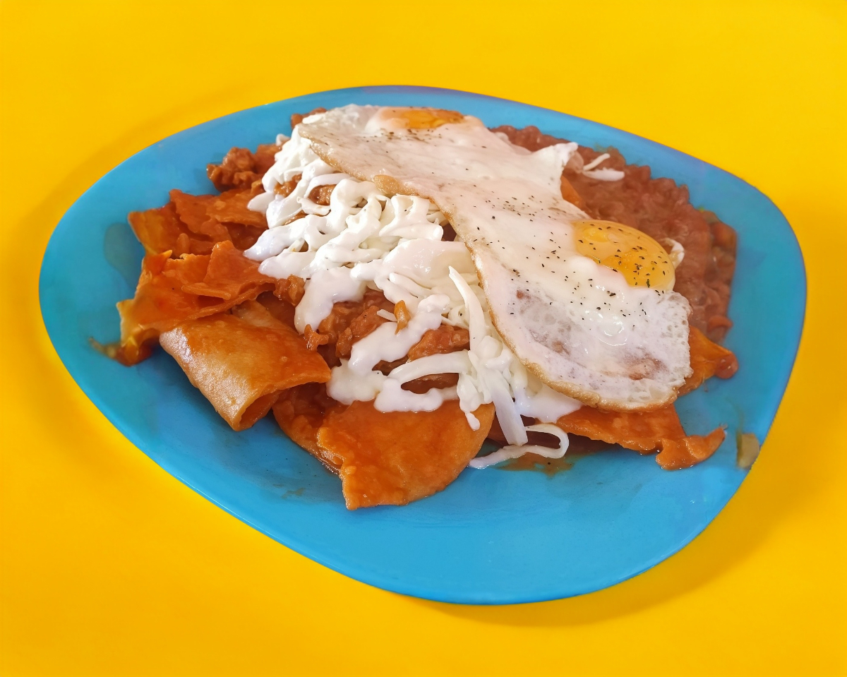 Chilaquiles con huevos estrellados acompañados con queso blanco y crema, el cliente puede elegir entre huevos revueltos o estrellados.