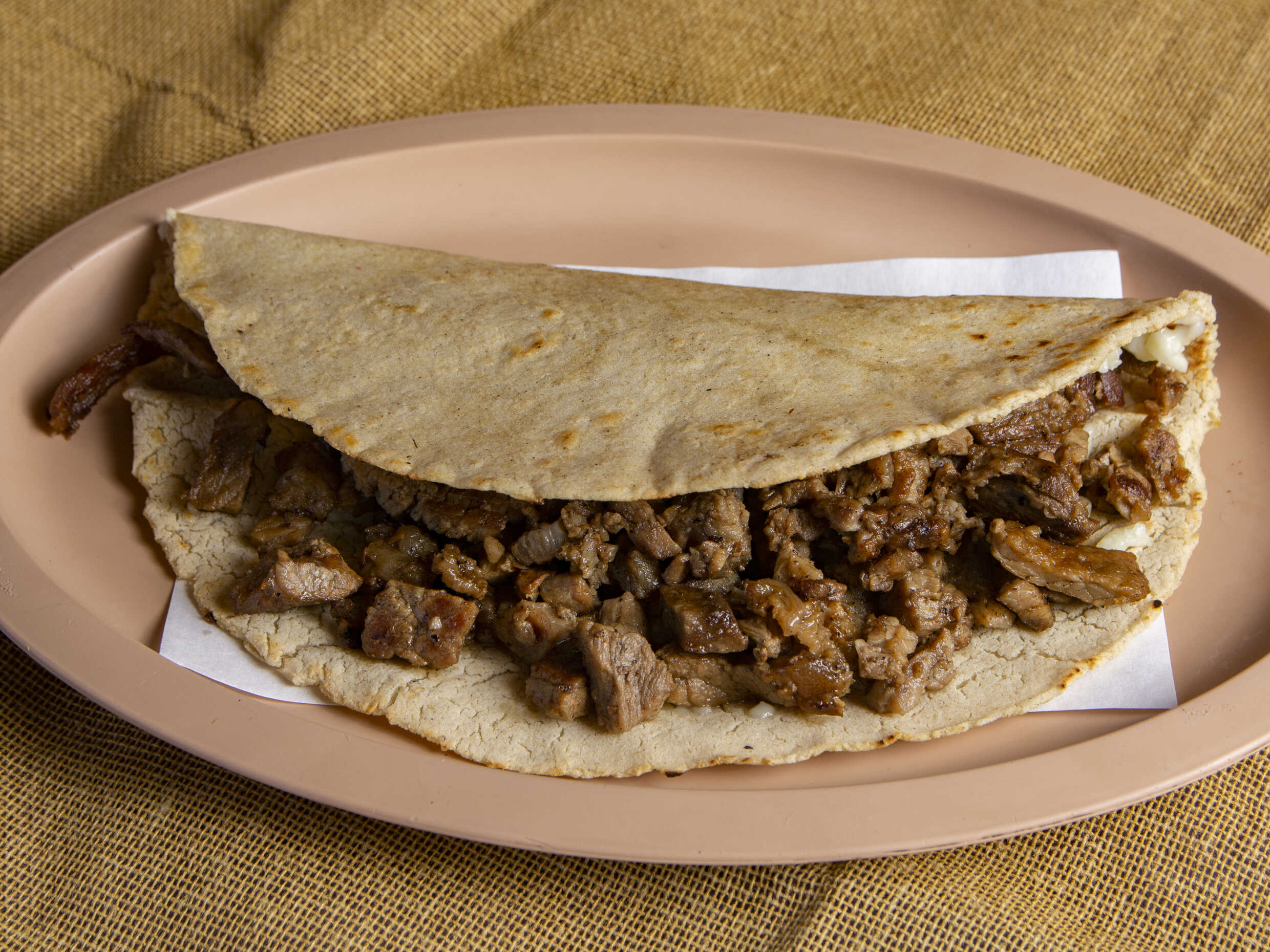 Una quesadilla doble tortilla de Maíz , queso y Escoge tu carne de 30graprox.