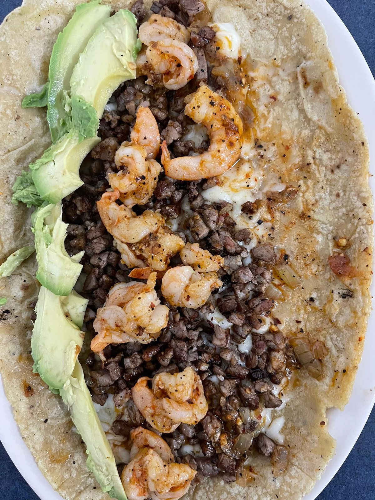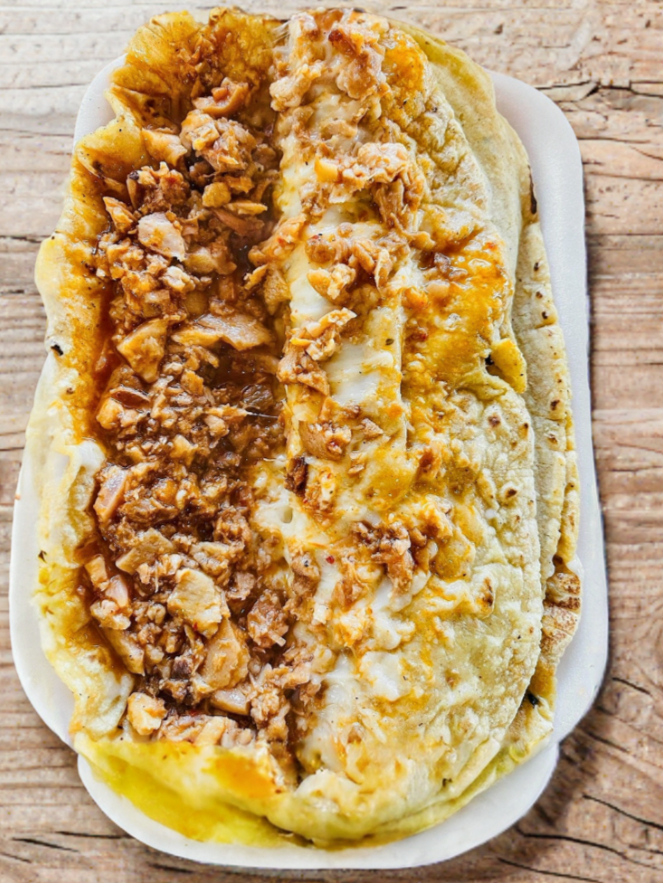 Quesadilla con Carne Asada acompañada de pico de gallo, limón, salsas verde y roja. (Personal)