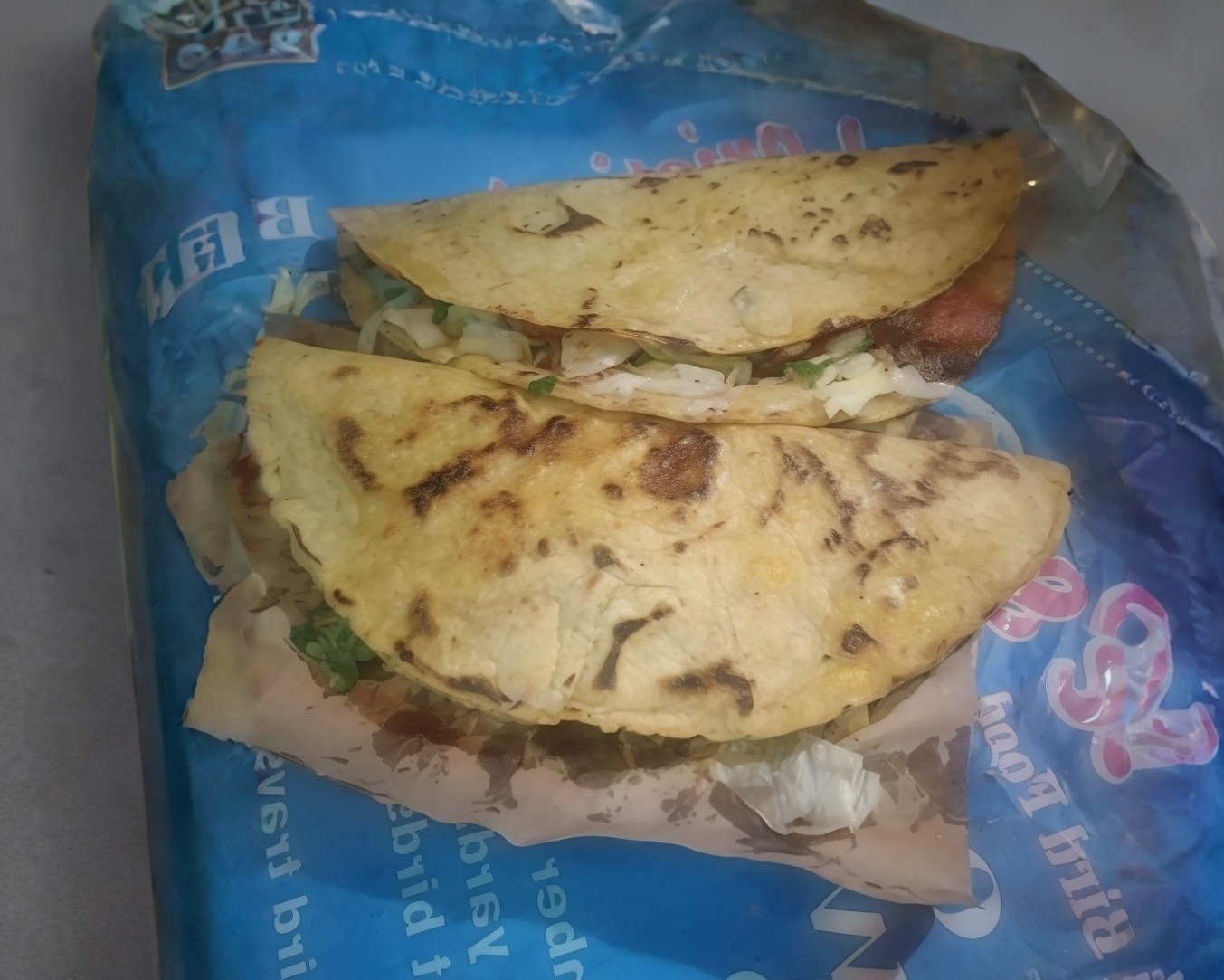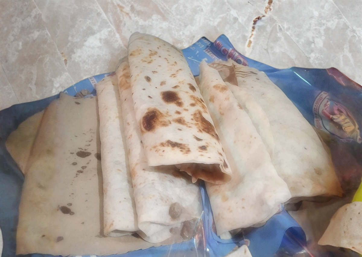 Tortilla grande ,frijoles , carne , lechuga y tomate.