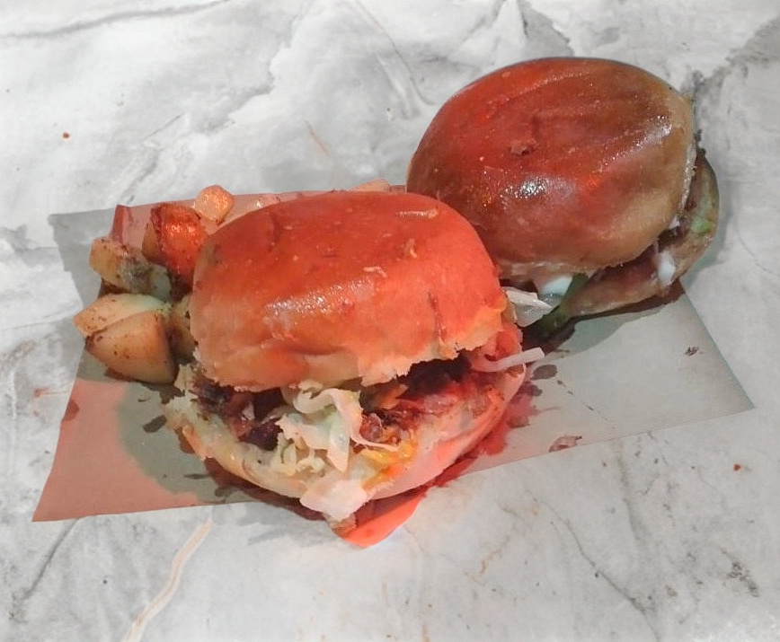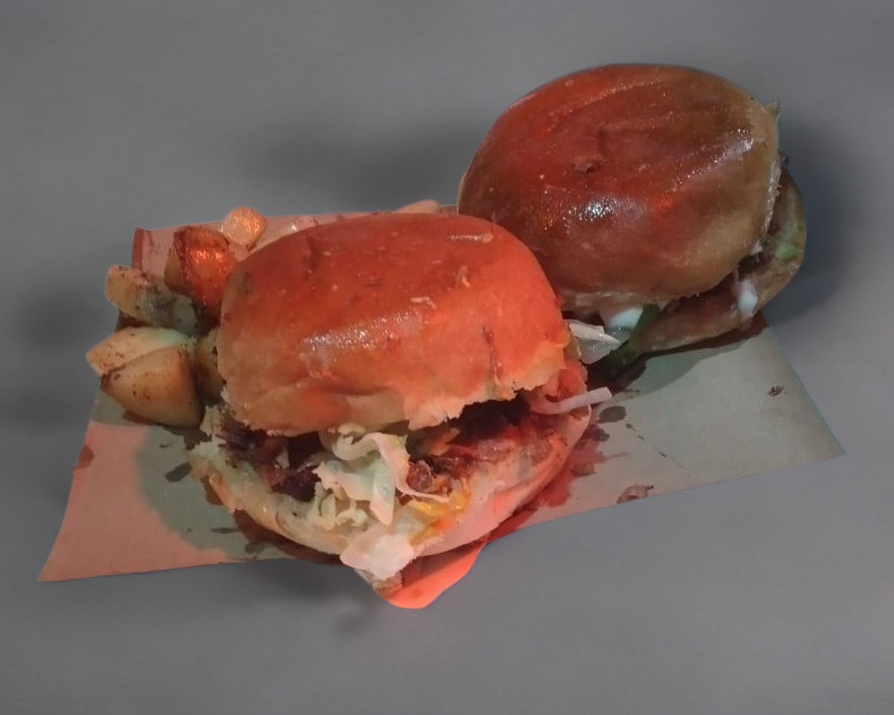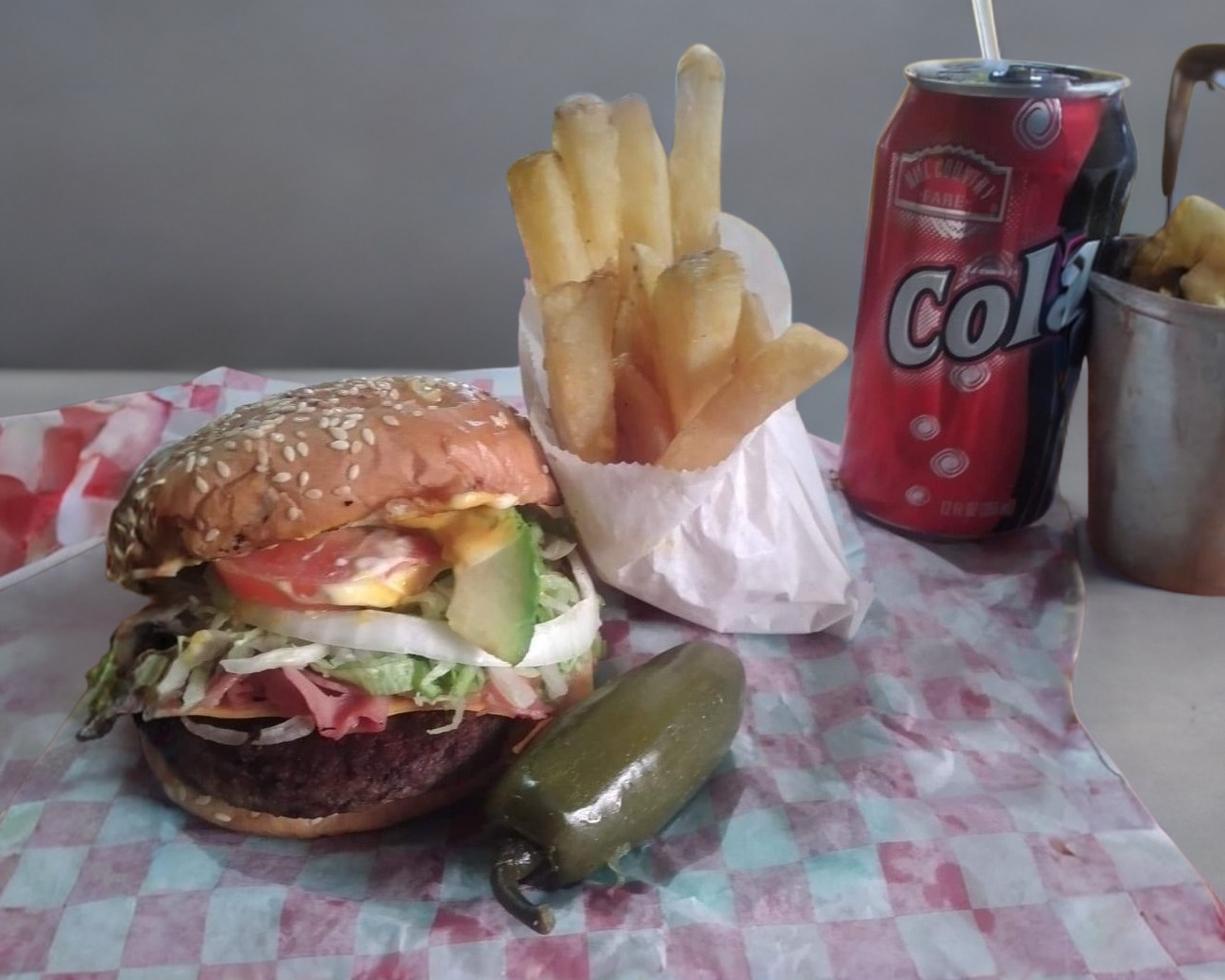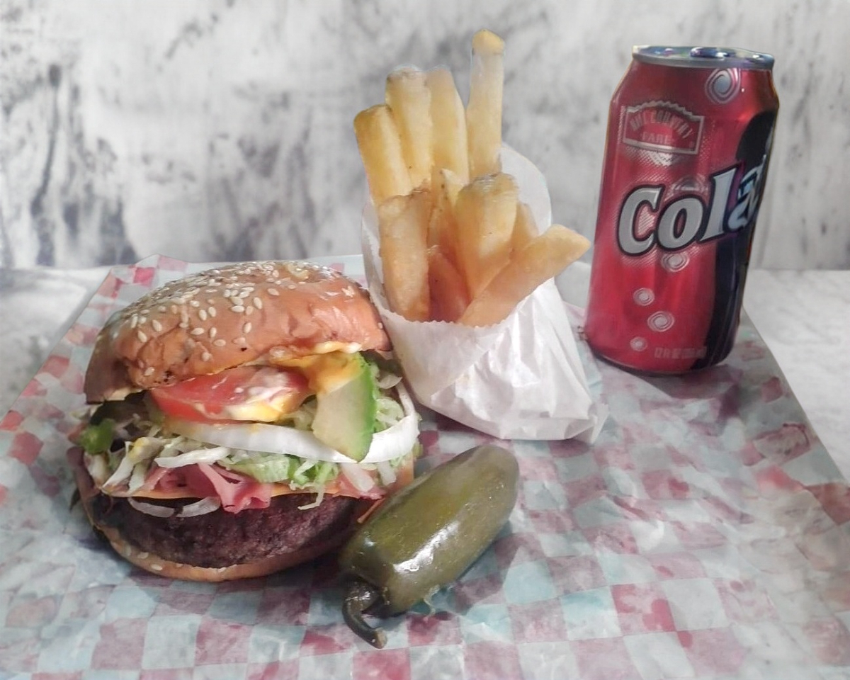 Pan de ajonjoli, aros de cebolla, tomate, doble queso, aguacate, papas