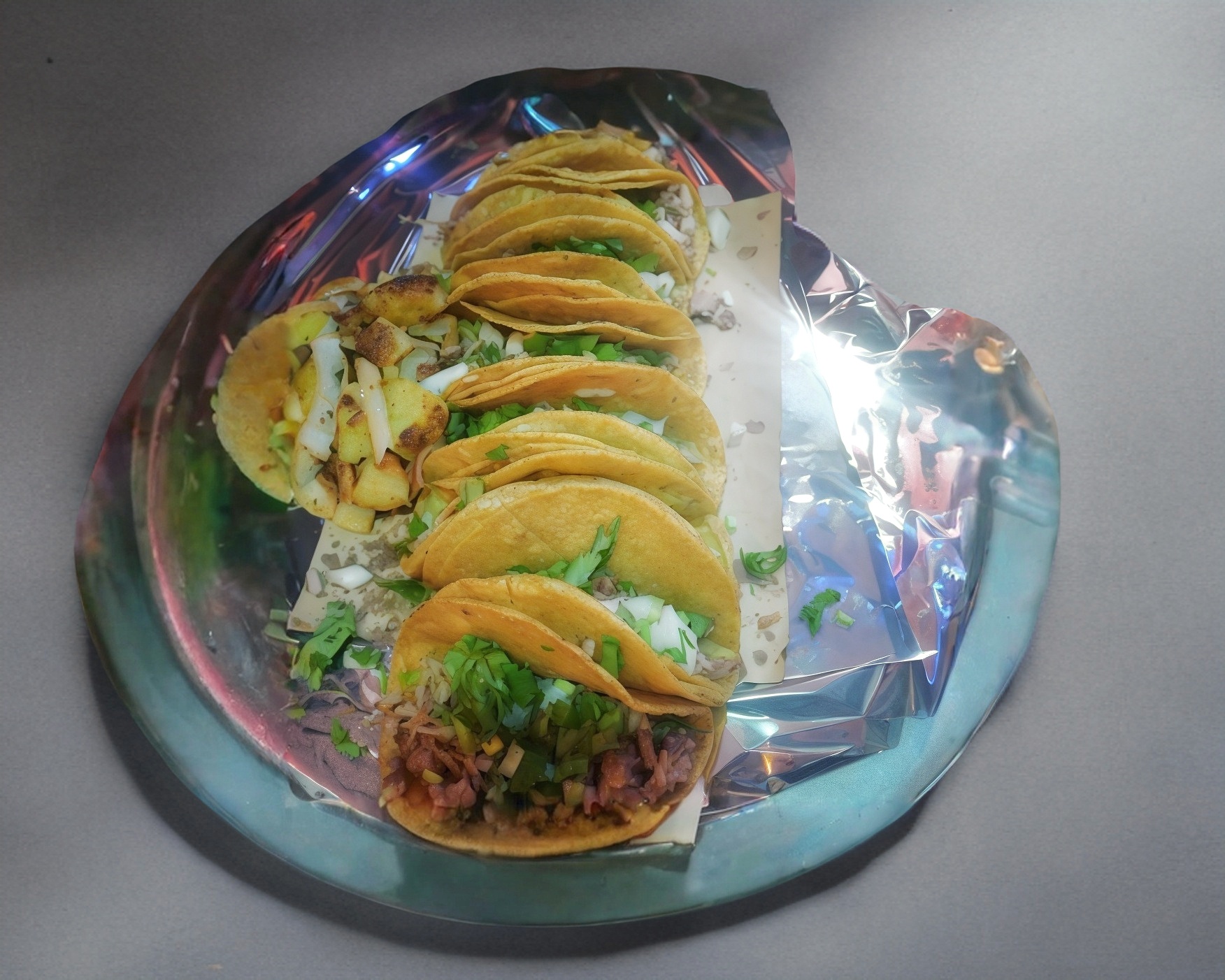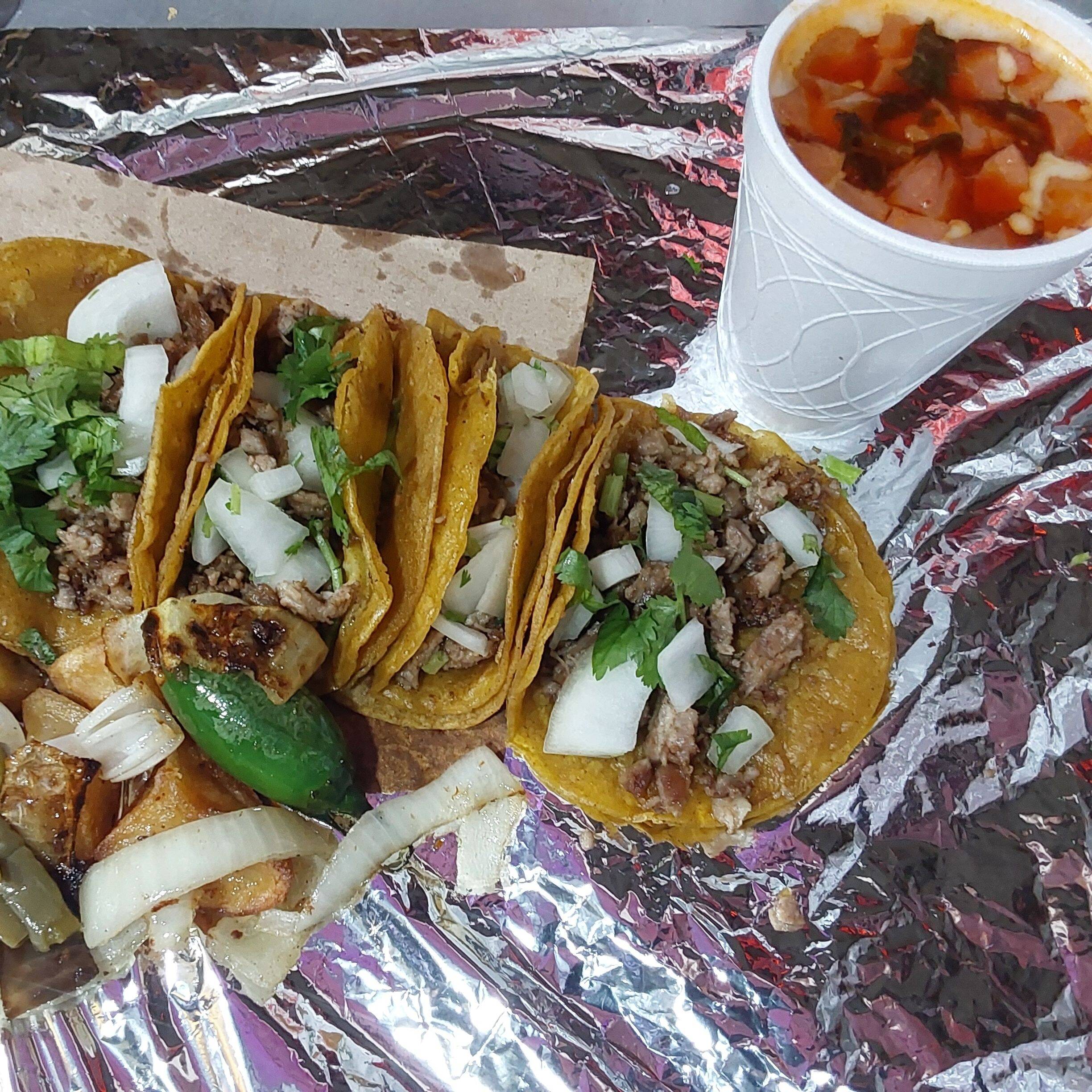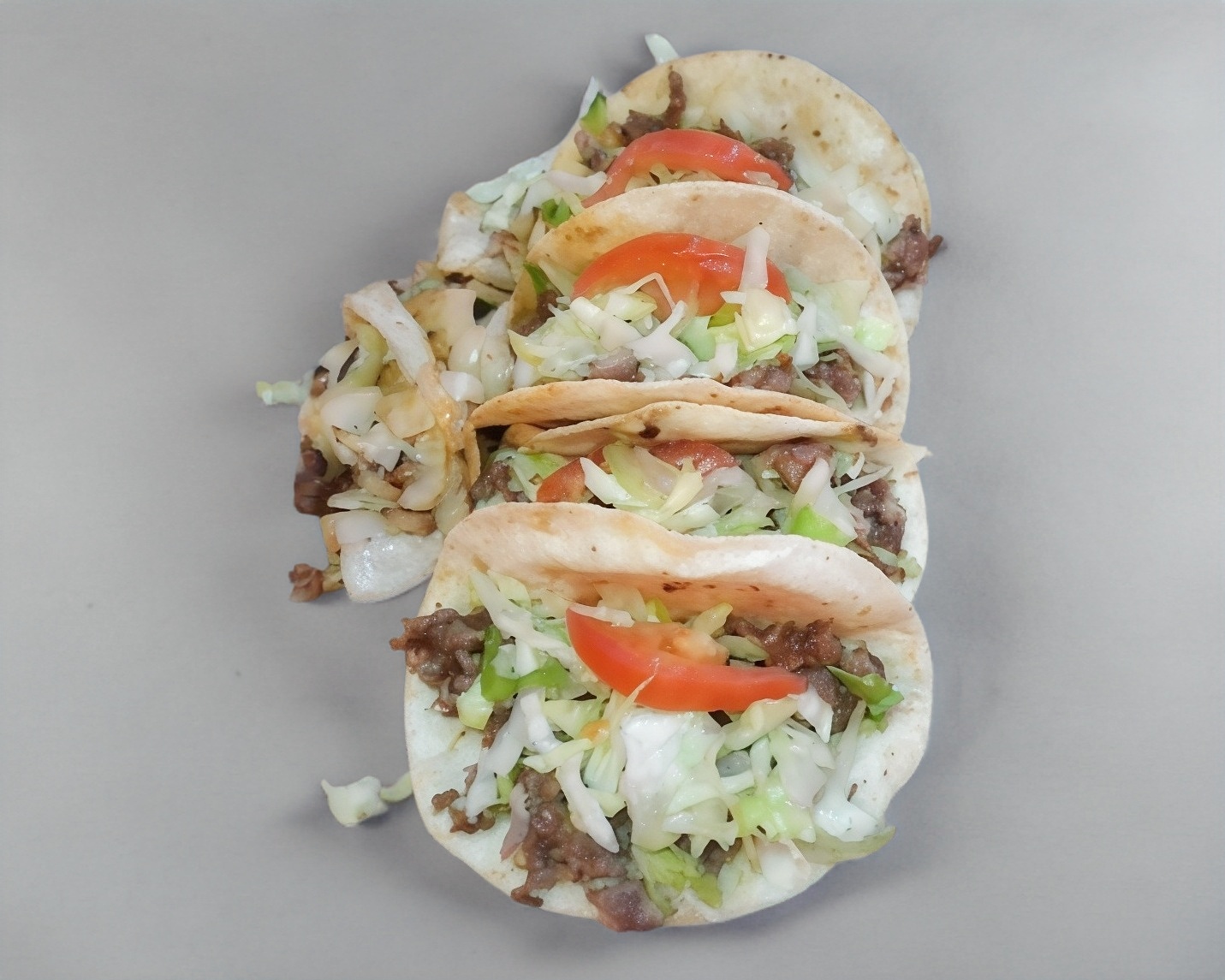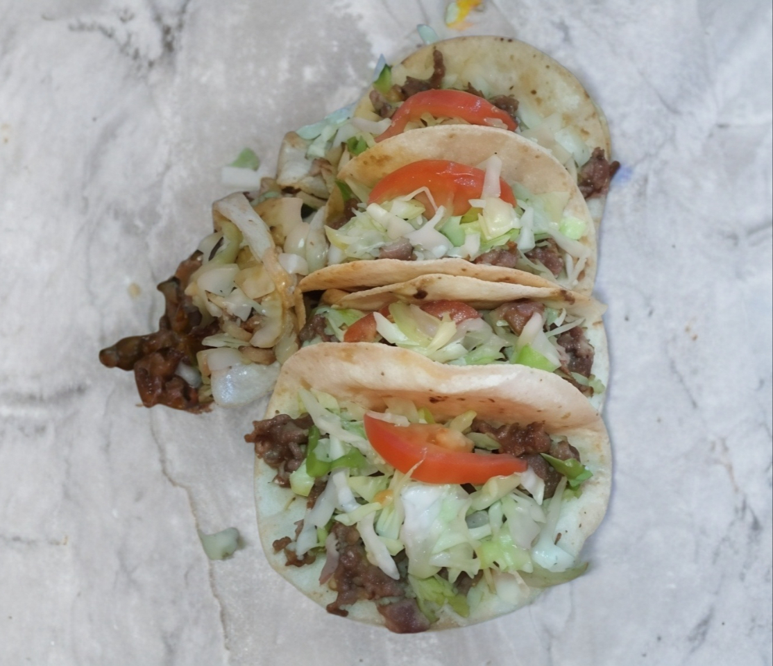 Tacos ( 5 piezas) cebolla, cilantro, salsa verde ó roja , limón, papa en cuadros, carne de res en bistec.