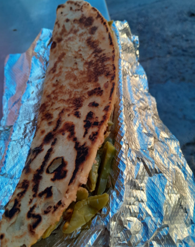Esta deliciosa preparación está hecha en una tortilla de maíz de tamaño mediano, que le da una base tradicional y auténtica. En su interior lleva una combinación sencilla pero muy sabrosa de queso asadero, frijoles y nopales. El queso asadero aporta una textura suave y un sabor cremoso al fundirse, mientras que los frijoles añaden un toque casero y nutritivo. Los nopales complementan el platillo c