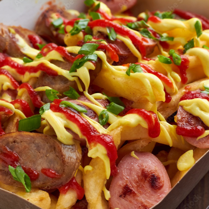 Salchichas, papas, queso cheddar, ketchup, mayonesa crema, chettos flaming en polvo y frijoles