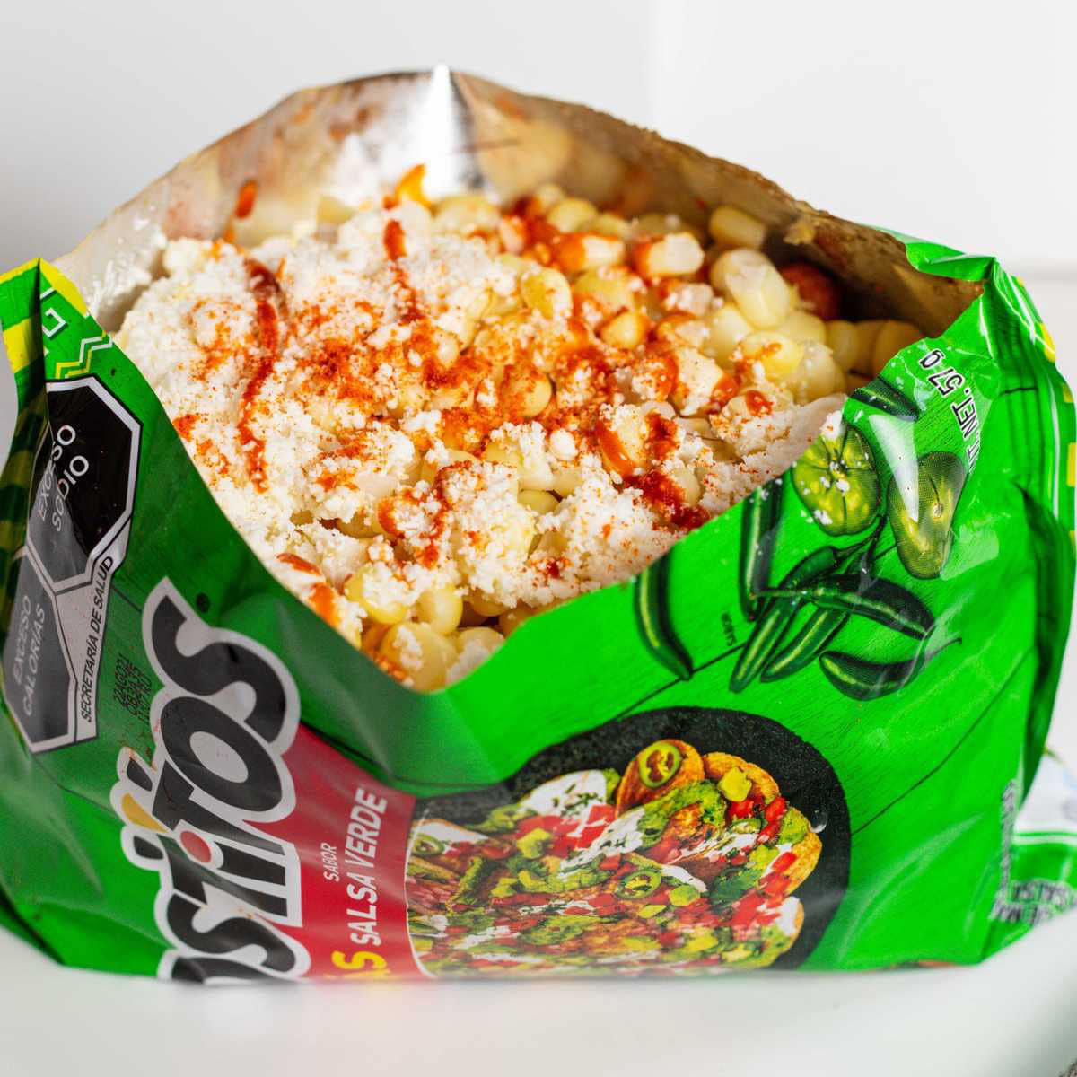 Tostitos verdes, Queso cheddar, elote amarillo, crema, salsa preparada y queso fresco rallado. Los ingredientes se sirven por separado.