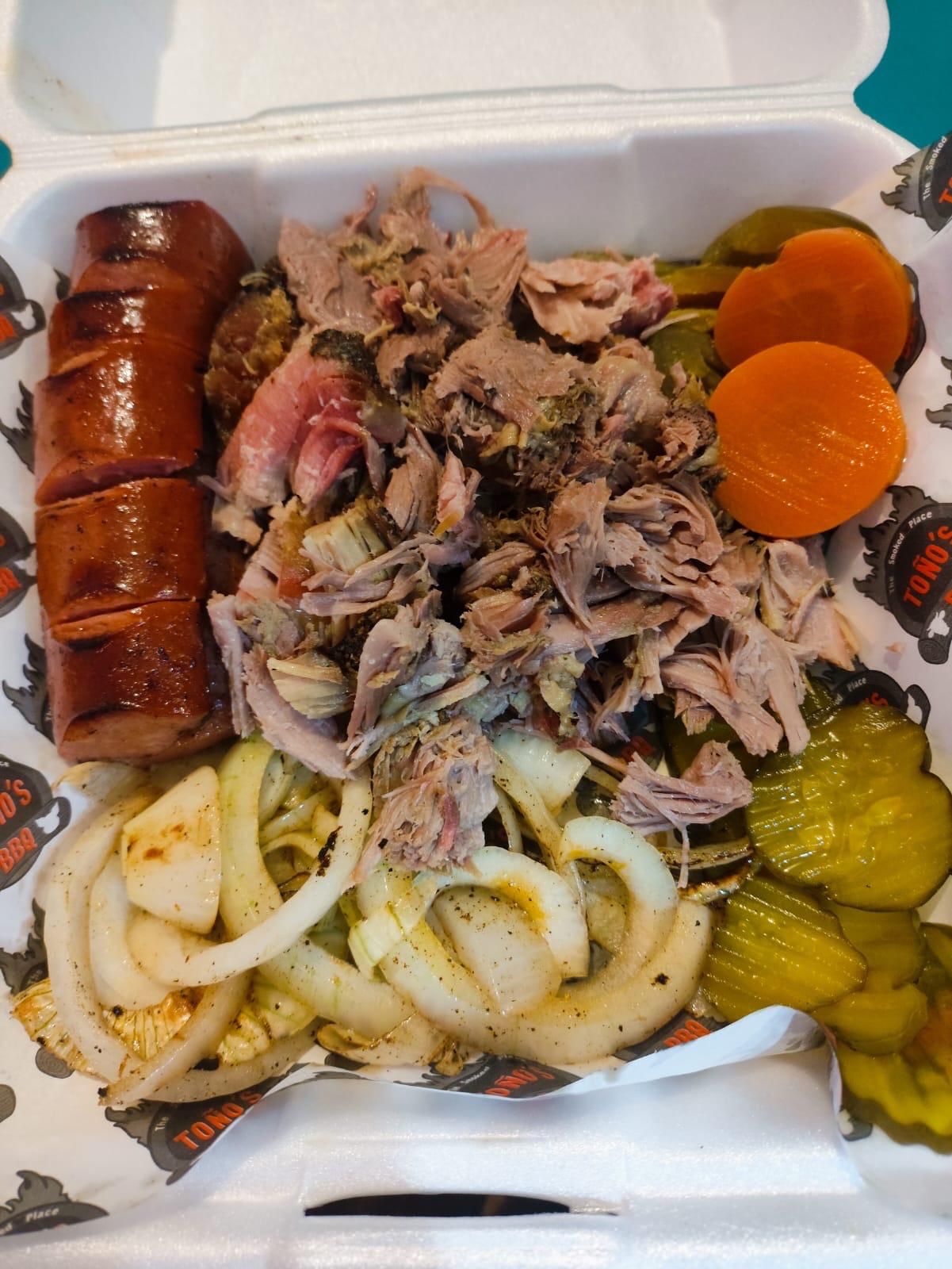Brisket Ahumado, Salchicha, Frijoles Bbq, pan, cebolla, pepinillos y salsas
