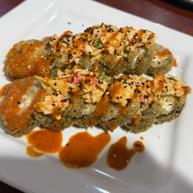 camaron empanizado , philadelphia , aguacate y chile chipople encima