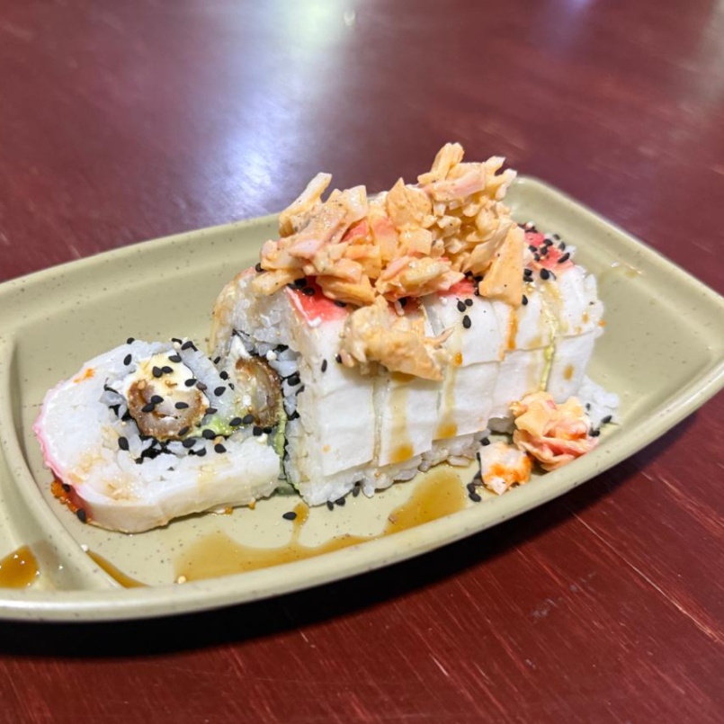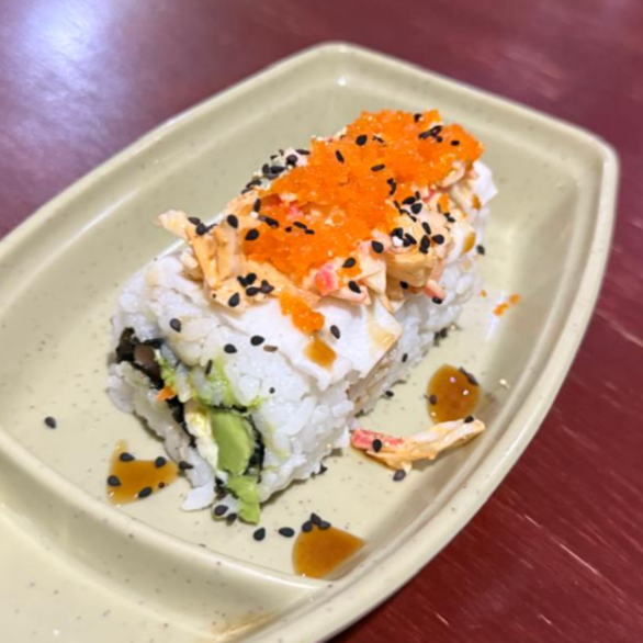 salmon, zanahoria, philadelphia , aguacate , envuelto en surimi , salsa tampico, y mazago al exterior