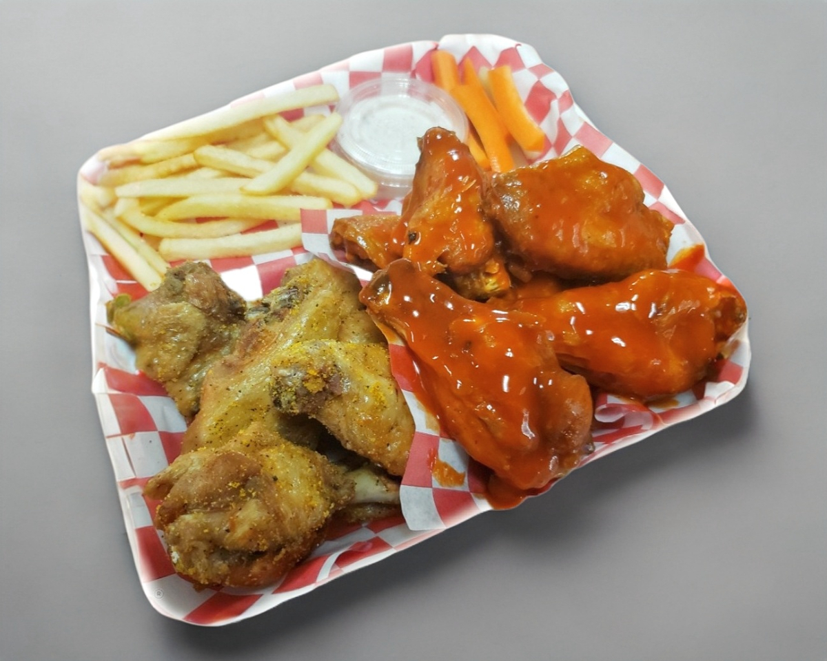 10 PIEZAS PUEDES ELEGIR 2 SALSAS (10 PZAS POR SALSA) INCLUYE PORCION DE PAPAS,ZANAHORIA Y 1 ADEREZO RANCH