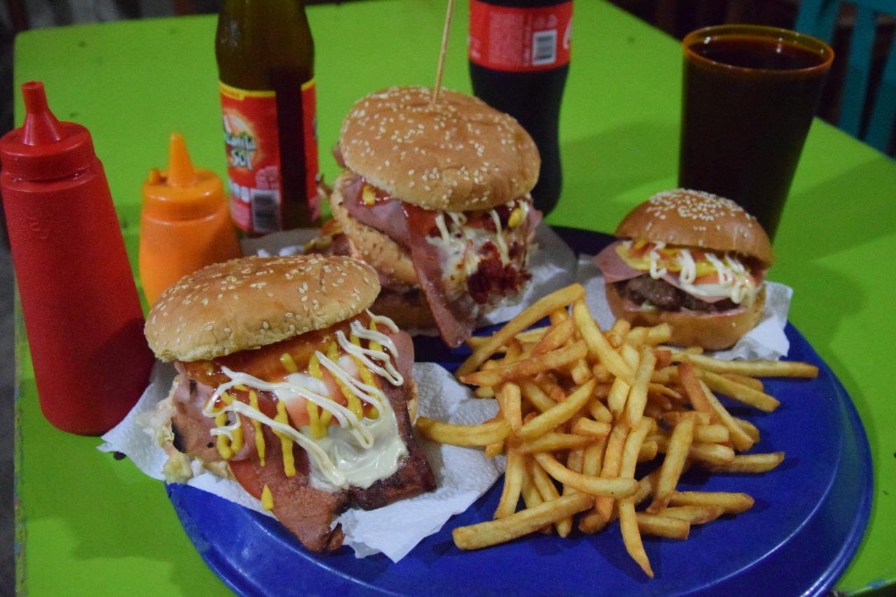 Hamburguesa con aderezo, lechuga, tomate, picante, queso amarillo, jamon, piña, chorizo, quesillo, y 1 carne.