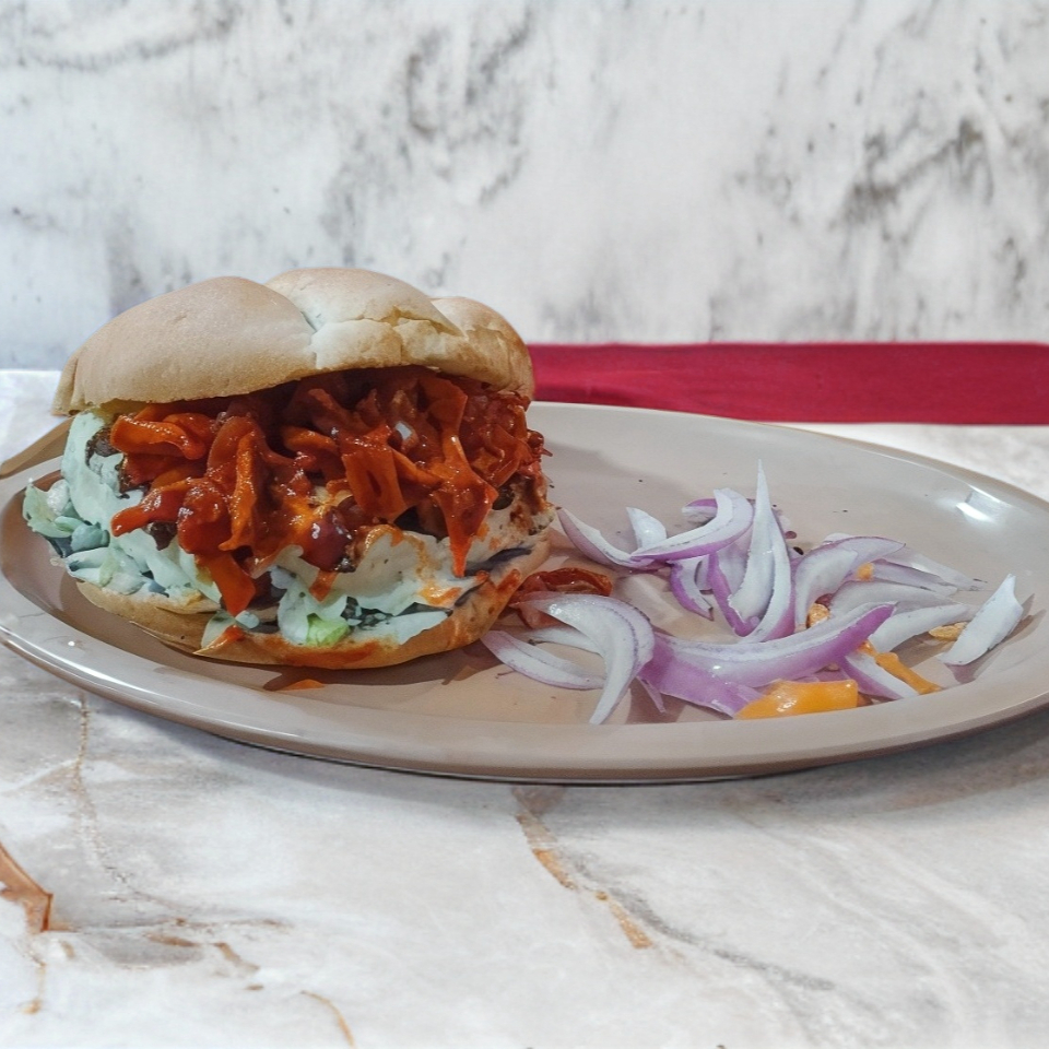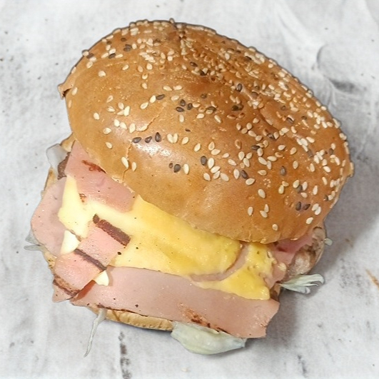 Hamburguesa con aderezo, lechuga, tomate, picante, queso amarillo, jamon, piña, y 1 carne pequeña.